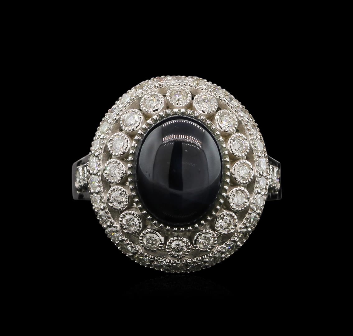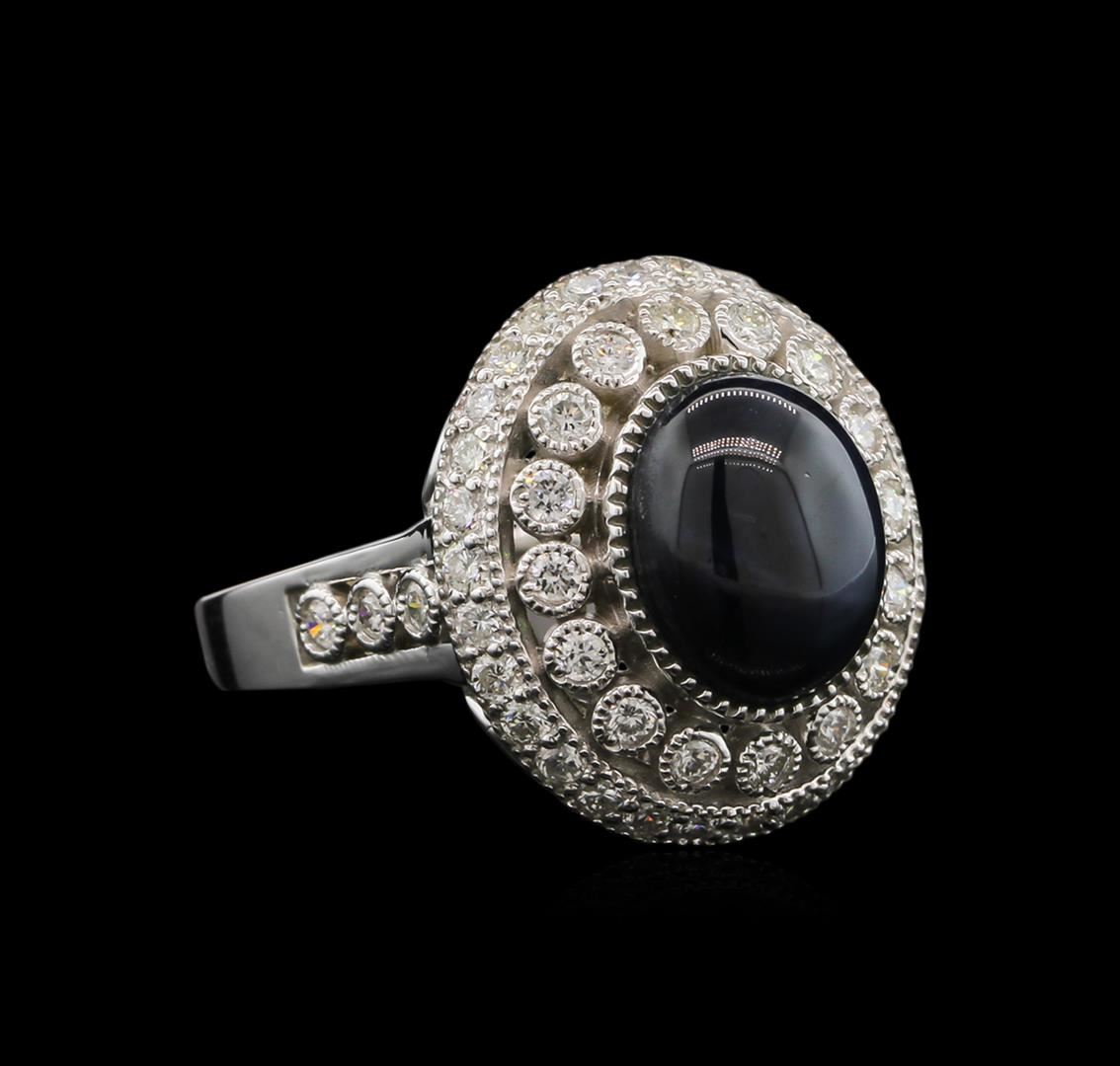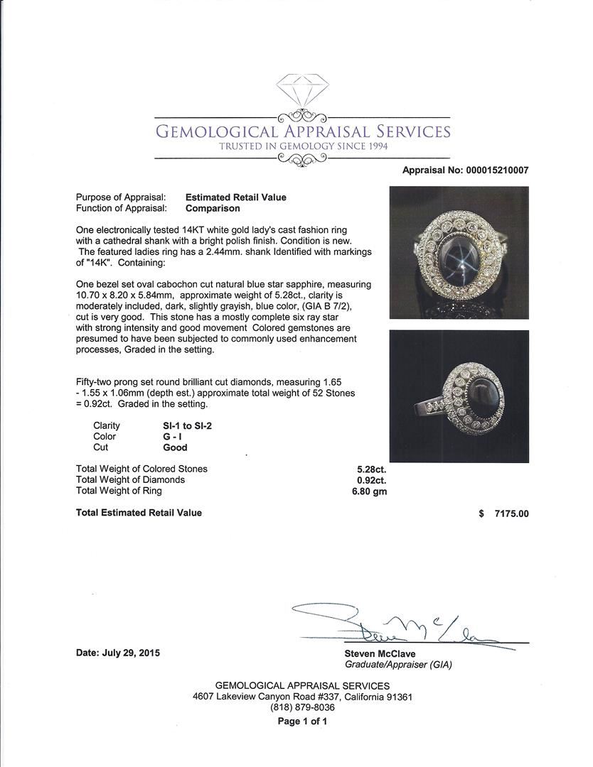 One electronically tested 14KT white gold lady's cast fashion ring with a cathedral shank with a bright polish finish. The featured ladies ring has a 2.44mm. shank Identified with markings of "14K". Condition is new. Containing: One bezel set oval cabochon cut natural blue star sapphire, measuring 10.70 x 8.20 x 5.84mm, approximate weight of 5.28ct., clarity is moderately included, dark, slightly grayish, blue color, (GIA B 7/2), cut is very good. This stone has a mostly complete six ray star with strong intensity and good movement. Colored gemstones are presumed to have been subjected to commonly used enhancement processes, Graded in the setting. Fifty-Two prong set round brilliant cut diamonds, measuring 1.65 - 1.55 x 1.06mm (depth est.) approximate. Total Weight of 52 Stones = 0.92ct. Graded in the setting. Clarity: SI-1 to SI-2. Color: G - I. Cut Good. Total Weight of Colored Stones 5.28ct. Total Weight of Diamonds 0.92ct. Total Weight of Ring 6.80gm. GAS Appraised at $7,175.00.