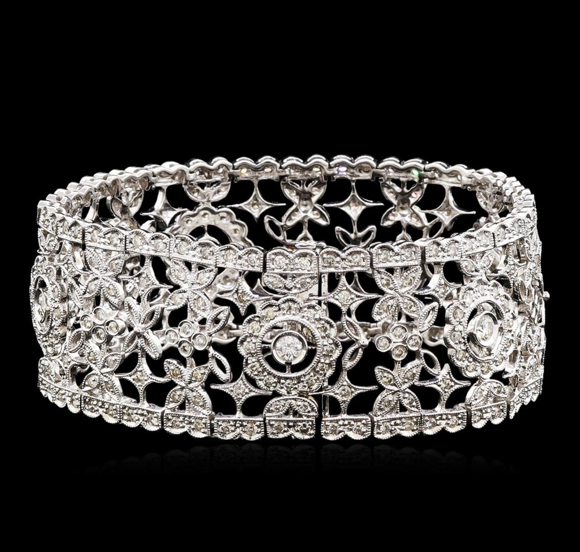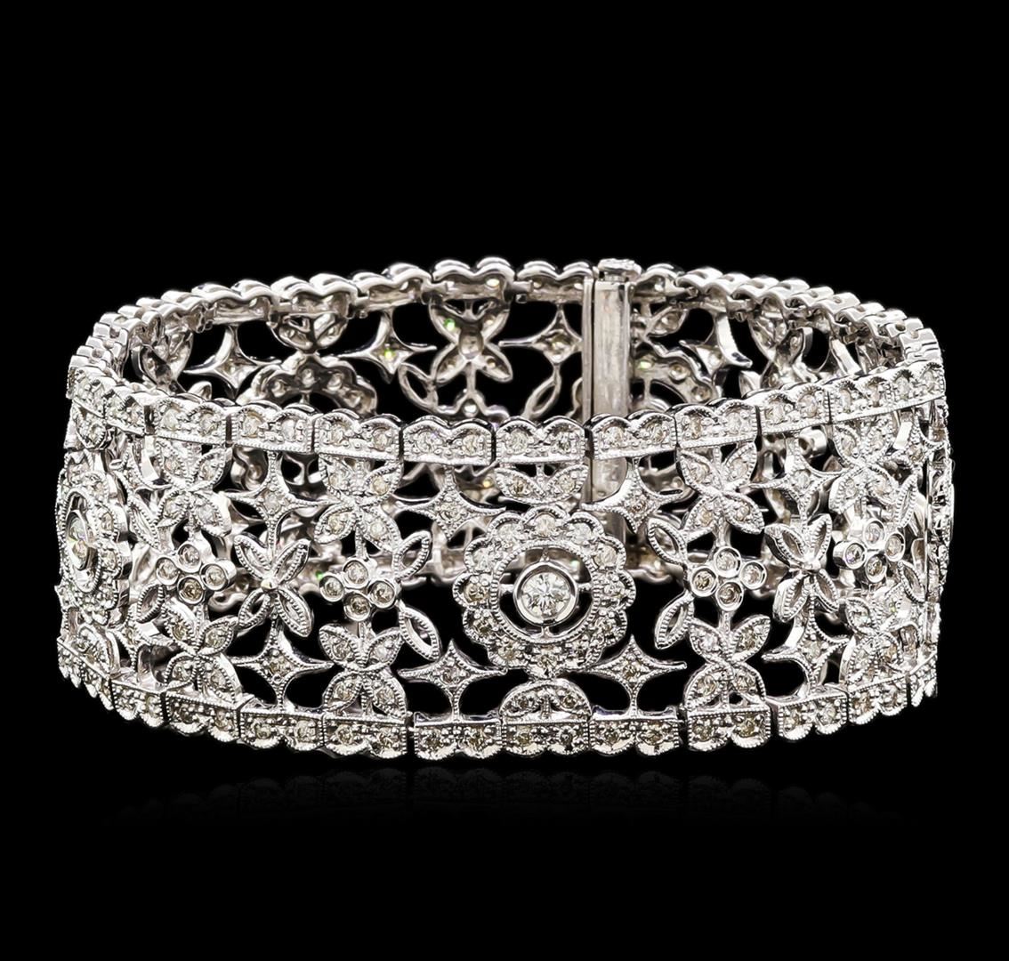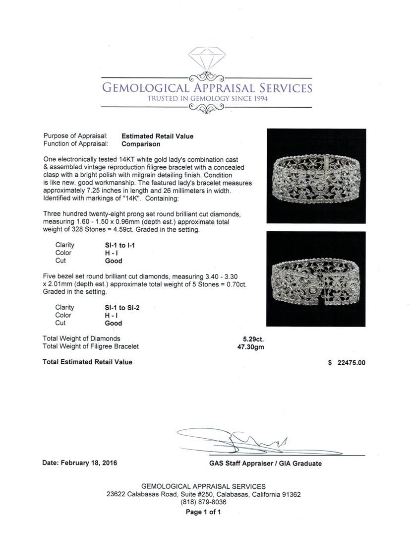 One electronically tested 14KT white gold lady's combination cast & assembled vintage reproduction filigree bracelet with a concealed clasp with a bright polish with milgrain detailing finish. The featured lady's bracelet measures approximately 7.25 inches in length and 26 millimeters in width. Identified with markings of "14K". Condition is like new, good workmanship. Containing: Three Hundred Twenty-Eight prong set round brilliant cut diamonds, measuring 1.60 - 1.50 x 0.96mm (depth est.) approximate total weight of 328 Stones = 4.59ct. Graded in the setting. Clarity: SI-1 to I-1. Color: H - I. Cut Good Five bezel set round brilliant cut diamonds, measuring 3.40 - 3.30 x 2.01mm (depth est.) approximate total weight of 5 Stones = 0.70ct. Graded in the setting. Clarity: SI-1 to SI-2. Color: H - I. Cut Good. Total Weight of Diamonds 5.29ct. Total Weight of Filigree Bracelet 47.30gm. GAS Appraised at $22,475.00.