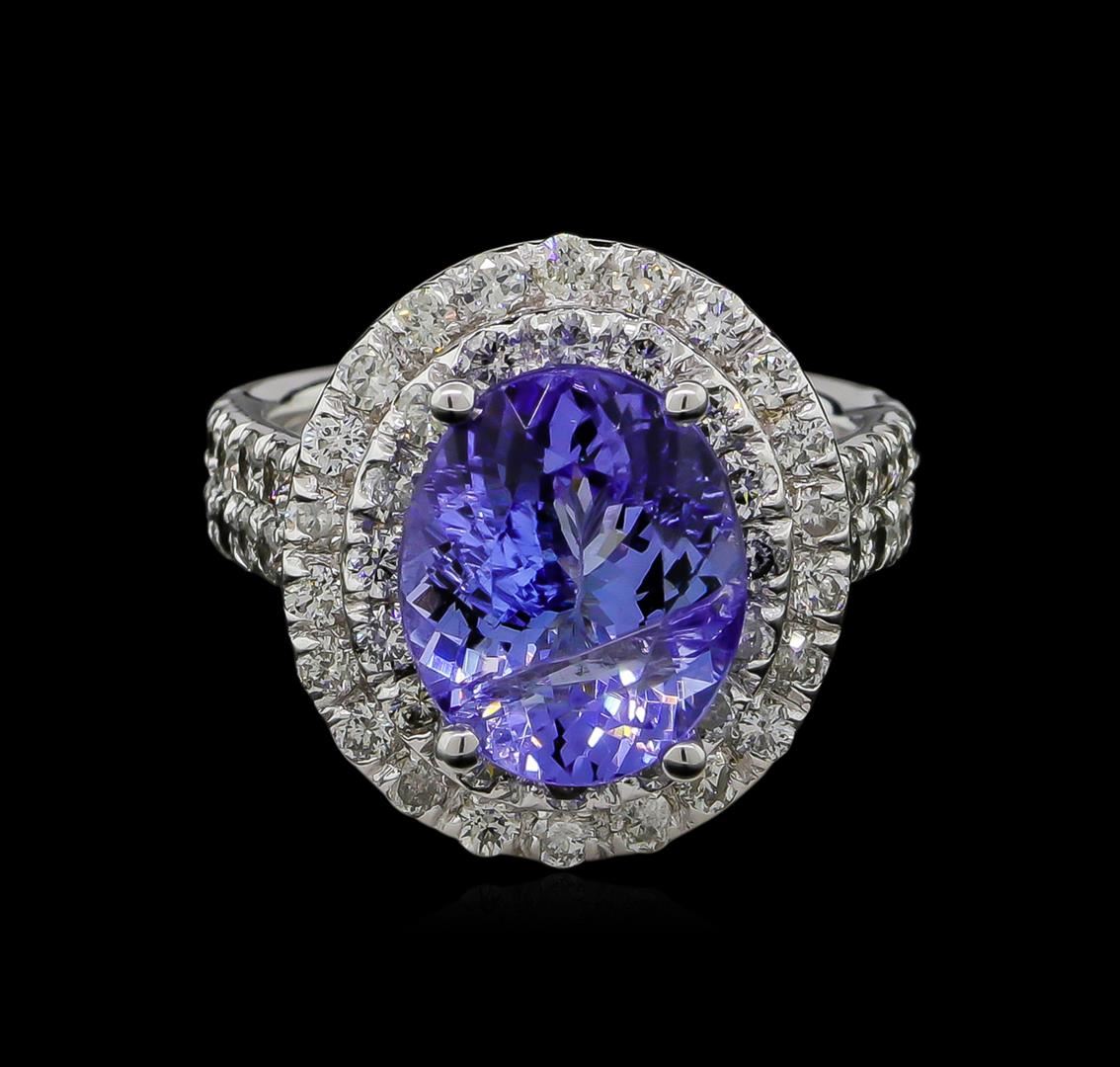 One electronically tested 14KT white gold ladies cast tanzanite & diamond ring with a bright finish. The featured tanzanite is set within tiered diamond bezels, supported by diamond set shoulders, completed by a four millimeter wide band. Identified with markings of "14K". Condition is new, good workmanship. Containing: One prong set oval mixed cut natural tanzanite, measuring 11.20 x 9.50 x 6.60mm, 7%. bulge factor, approximate weight of 5.29ct., clarity is heavily included, type I, medium light, very slightly grayish, bluish violet color, (GIA bV 4/3), cut is good. Transmitting light with some distortion. Internal & external characteristics are present, including a large surface feather. Colored Stone Grading Report attached. Graded in the setting. Tanzanite is a very rare gemstone that is only found in the country of Tanzania. Originally discovered in 1967. Tiffany & Company, named the stone Tanzanite. It is found in the Usumburu Mountains that border the Umba Valley of northern Tanzania. Tanzanite occurs in gray, brown, violet, blue, reddish-purple, & green. The gem is interesting because of its exceptional pleochroism. Rotated in different directions a tanzanite will exhibit multiple changes of color. Tanzanite has a low tolerance to ultrasonic cleaning, and should not be cleaned using this method. Seventy-Four prong set round brilliant cut diamonds, measuring 1.95 - 1.80 x 1.15mm (depth est.) approximate total weight of 74 Stones = 1.82ct. Graded in the setting. Clarity: SI-2 to I-2. Color: G - I. Total Weight of Colored Stones 5.29ct. Total Weight of Diamonds 1.82ct. Total Weight of Ring 8.76gm. AIG Appraised at $8,275.00.