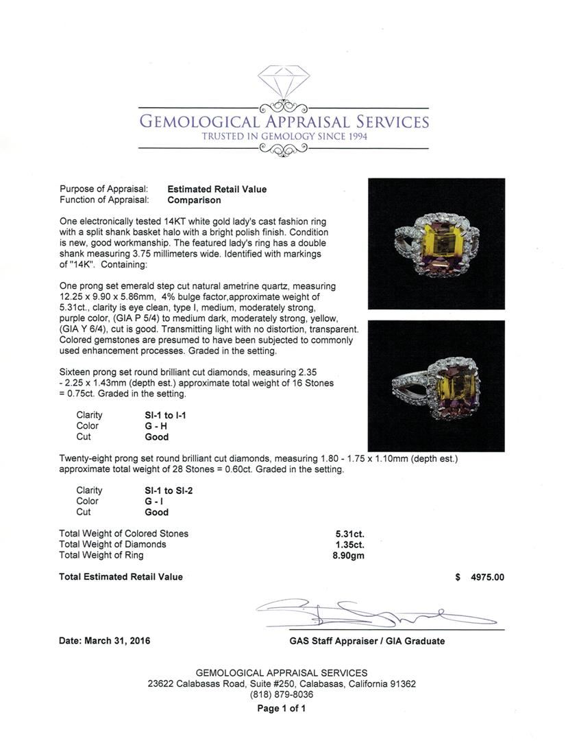 One electronically tested 14KT white gold lady's cast fashion ring with a split shank basket halo with a bright polish finish. The featured lady's ring has a double shank measuring 3.75 millimeters wide. Identified with markings of "14K". Condition is new, good workmanship. Containing: One prong set emerald step cut natural ametrine quartz, measuring 12.25 x 9.90 x 5.86mm, 4%. bulge factor, approximate weight of 5.31ct., clarity is eye clean, type I, medium, moderately strong, purple color, (GIA P 5/4) to medium dark, moderately strong, yellow, (GIA Y 6/4), cut is good. Transmitting light with no distortion, transparent. Colored gemstones are presumed to have been subjected to commonly used enhancement processes. Graded in the setting. Sixteen prong set round brilliant cut diamonds, measuring 2.35 - 2.25 x 1.43mm (depth est.) approximate total weight of 16 Stones = 0.75ct. Graded in the setting. Clarity: SI-1 to I-1. Color: G - Good Twenty-Eight prong set round brilliant cut diamonds, measuring 1.80 - 1.75 x 1.10mm (depth est.) approximate total weight of 28 Stones = 0.60ct. Graded in the setting. Clarity: SI-1 to SI-2. Color: G - I. Cut Good. Total Weight of Colored Stones 5.31ct. Total Weight of Diamonds 1.35ct. Total Weight of Ring 8.90gm GAS Appraised.