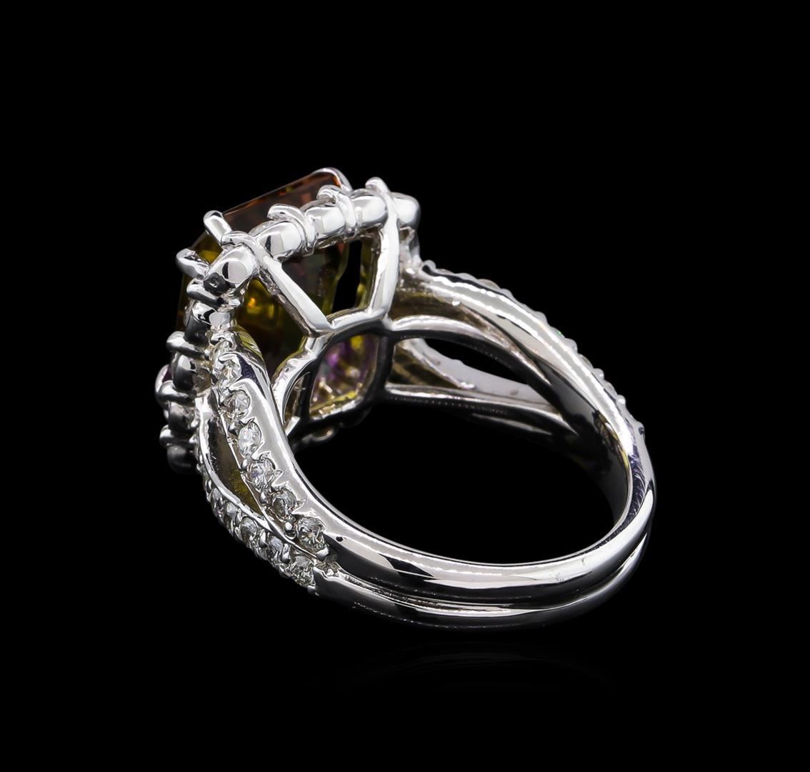 One electronically tested 14KT white gold lady's cast fashion ring with a split shank basket halo with a bright polish finish. The featured lady's ring has a double shank measuring 3.75 millimeters wide. Identified with markings of "14K". Condition is new, good workmanship. Containing: One prong set emerald step cut natural ametrine quartz, measuring 12.25 x 9.90 x 5.86mm, 4%. bulge factor, approximate weight of 5.31ct., clarity is eye clean, type I, medium, moderately strong, purple color, (GIA P 5/4) to medium dark, moderately strong, yellow, (GIA Y 6/4), cut is good. Transmitting light with no distortion, transparent. Colored gemstones are presumed to have been subjected to commonly used enhancement processes. Graded in the setting. Sixteen prong set round brilliant cut diamonds, measuring 2.35 - 2.25 x 1.43mm (depth est.) approximate total weight of 16 Stones = 0.75ct. Graded in the setting. Clarity: SI-1 to I-1. Color: G - Good Twenty-Eight prong set round brilliant cut diamonds, measuring 1.80 - 1.75 x 1.10mm (depth est.) approximate total weight of 28 Stones = 0.60 ct. Graded in the setting. Clarity: SI-1 to SI-2. Color: G - I. Cut Good. Total Weight of Colored Stones 5.31ct. Total Weight of Diamonds 1.35ct. Total Weight of Ring 8.90gm GAS Appraised.