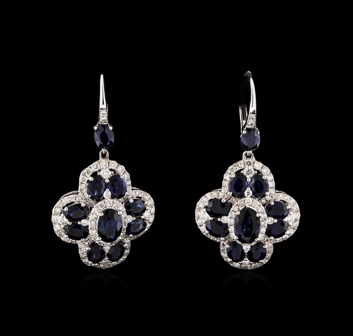 One pair electronically tested 18KT white gold lady's combination cast & assembled fashion earrings with hinged clip backs with a bright polish finish. Identified with markings of "750". Condition is new, good workmanship. Containing: Two prong set oval modified brilliant cut natural blue sapphires, measuring 5.84 x 4.10 x 2.67mm, approximate total weight of 1.08ct., clarity is moderately included, type II, dark, very slightly grayish, blue color, (GIA B 7/3), cut is good. Transmitting light somewhat diffusely, transparent to translucent. Colored gemstones are presumed to have been subjected to commonly used enhancement processes. Graded in the setting. Eighteen prong set oval modified brilliant cut natural blue sapphires, measuring 4.20 x 3.00 x 1.96mm, 10%. bulge factor, approximate total weight of 4.24ct., clarity is slightly included, type II, medium dark, moderately strong, violetish blue color, (GIA vB 6/4), cut is good. Transmitting light with a minimum of distortion, transparent. Colored gemstones are presumed to have been subjected to commonly used enhancement processes. Graded in the setting. Eight prong set round brilliant cut diamonds, measuring 1.80 - 1.70 x 1.07mm (depth est.) approximate total weight of 8 Stones = 0.16ct. Graded in the setting. Clarity: VS-2 to SI-1 . Color: H - I. Cut Very Good One Hundred Fifty prong set round brilliant cut diamonds, measuring 1.35 - 1.10 x 0.74mm (depth est.) approximate total weight of 150 Stones = 1.01ct. Graded in the setting. Clarity: SI-1 to SI-2 . Color: H - I. Cut Very Good. Total Weight of Colored Stones 5.32ct.. Total Weight of Diamonds 1.17ct.. Total Weight of Earrings 7.20gm. GAS Appraised at $9,270.00.