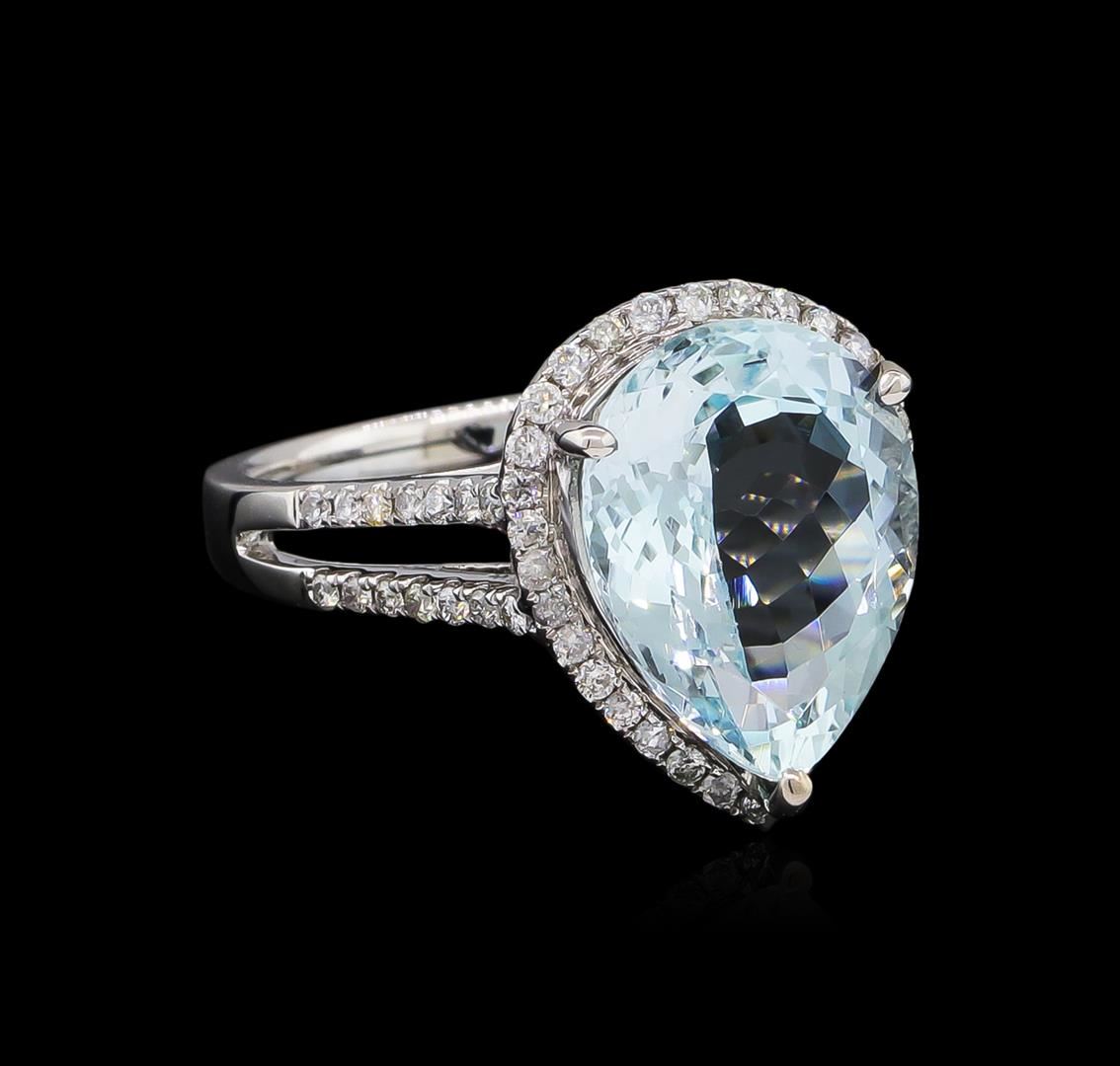 One electronically tested 14KT white gold lady's cast fashion ring with a split shank halo with a bright polish finish. The featured lady's ring has a shank measuring 2.45 millimeters wide. Trademark is Orianne. Identified with markings of "14K". Condition is new, good workmanship. Containing: One prong set pear modified brilliant cut natural aquamarine, measuring 14.30 x 10.84 x 6.44mm, approximate weight of 5.33ct., clarity is eye clean, type I, light, moderately strong, very slightly greenish blue color, (GIA vslgB 3/4), cut is very good. Transmitting light with no distortion, transparent. Colored gemstones are presumed to have been subjected to commonly used enhancement processes. Graded in the setting. Eighty-Nine prong set round brilliant cut diamonds, measuring 1.15 - 1.05 x 0.68mm (depth est.) approximate total weight of 89 Stones = 0.44ct. Graded in the setting. Clarity: SI-2 to I-1. Color: H - I. Cut Good. Total Weight of Colored Stones 5.33ct. Total Weight of Diamonds 0.44ct. Total Weight of Ring 6.80gm. GAS Appraised at $9,225.00.
