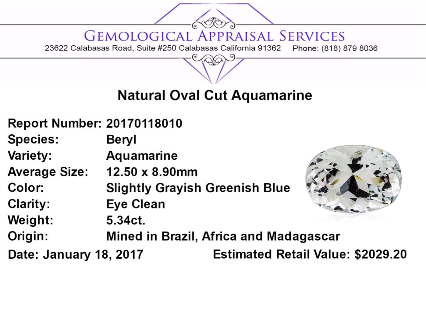 One natural oval cut aquamarine with an exact weight of 5.34ct., clarity is eye clean, slightly grayish greenish blue. Gemological Appraisals Services estimates the retail value at $2029.2 GAS Appraised.