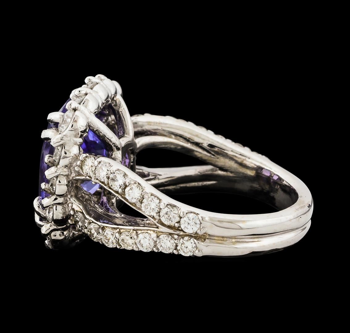 One electronically tested 14KT white gold lady's cast fashion ring with a split cathedral shank with a halo with a bright polish finish. The featured lady's ring has a double shank measuring 3.72 millimeters wide. Identified with markings of '14K'. Condition is new, good workmanship. Containing: One prong set rectangular cushion modified brilliant cut natural tanzanite, measuring 12.00 x 10.00 x 6.05mm, (depth est.) approximate weight of 5.34ct., clarity is eye clean, medium light, moderately strong, violetish blue color, (GIA vB 4/4), cut is very good. Transmitting light with no distortion, transparent. Colored gemstones are presumed to have been subjected to commonly used enhancement processes. Graded in the setting. Sixteen prong set round brilliant cut diamonds, measuring 2.60 - 2.50 x 1.56mm (depth est.) approximate total weight of 16 Stones = 1.00ct. Graded in the setting. Clarity SI-1 to SI-3. Color: G - I Cut Good Twenty-Eight prong set round brilliant cut diamonds, measuring 1.90 - 1.85 x 1.17mm (depth est.) approximate total weight of 28 Stones = 0.70ct. Graded in the setting. Clarity VS-2 to SI-2. Color: H - I Cut Good. Total Weight of Colored Stones 5.34ct.. Total Weight of Diamonds 1.70ct.. Total Weight of Ring 9.80gm. GAS Appraised at $12,235.00.
