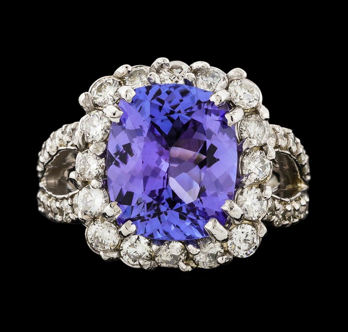 One electronically tested 14KT white gold lady's cast fashion ring with a split cathedral shank with a halo with a bright polish finish. The featured lady's ring has a double shank measuring 3.72 millimeters wide. Identified with markings of '14K'. Condition is new, good workmanship. Containing: One prong set rectangular cushion modified brilliant cut natural tanzanite, measuring 12.00 x 10.00 x 6.05mm, (depth est.) approximate weight of 5.34ct., clarity is eye clean, medium light, moderately strong, violetish blue color, (GIA vB 4/4), cut is very good. Transmitting light with no distortion, transparent. Colored gemstones are presumed to have been subjected to commonly used enhancement processes. Graded in the setting. Sixteen prong set round brilliant cut diamonds, measuring 2.60 - 2.50 x 1.56mm (depth est.) approximate total weight of 16 Stones = 1.00ct. Graded in the setting. Clarity SI-1 to SI-3. Color: G - I Cut Good Twenty-Eight prong set round brilliant cut diamonds, measuring 1.90 - 1.85 x 1.17mm (depth est.) approximate total weight of 28 Stones = 0.70ct. Graded in the setting. Clarity VS-2 to SI-2. Color: H - I Cut Good. Total Weight of Colored Stones 5.34ct.. Total Weight of Diamonds 1.70ct.. Total Weight of Ring 9.80gm. GAS Appraised at $12,235.00.