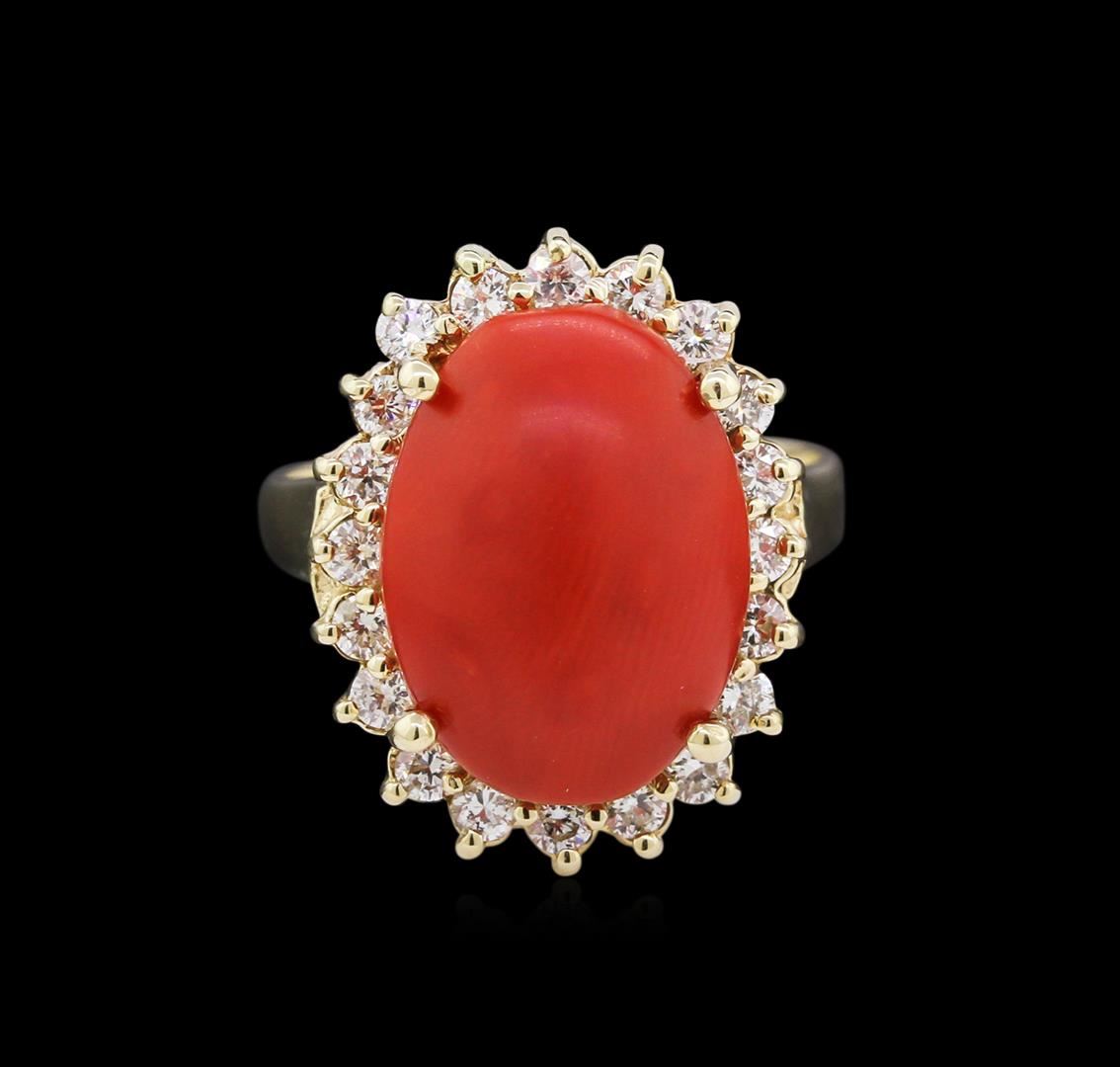 One ring featuring: 14KT yellow gold weighing 5.21 grams containing one coral with a total weight of 5.35ct and diamonds with a total weight of 0.59ct.