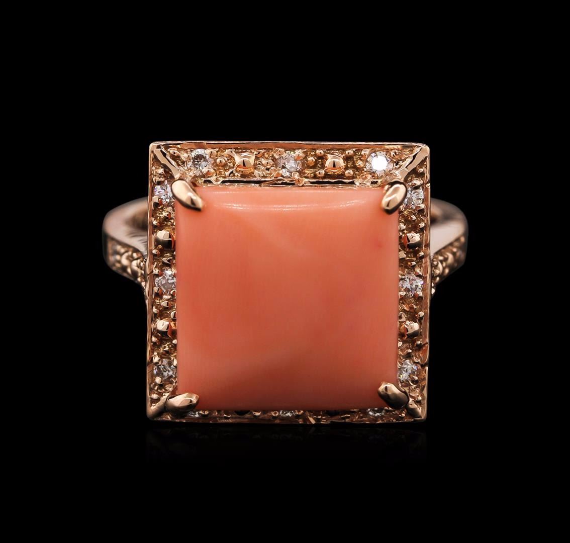 One ring featuring: 14KT rose gold weighing 6.07 grams containing one pink coral center stone with a total weight of 5.36ct and 16 diamonds with a total weight of 0.23ct.
