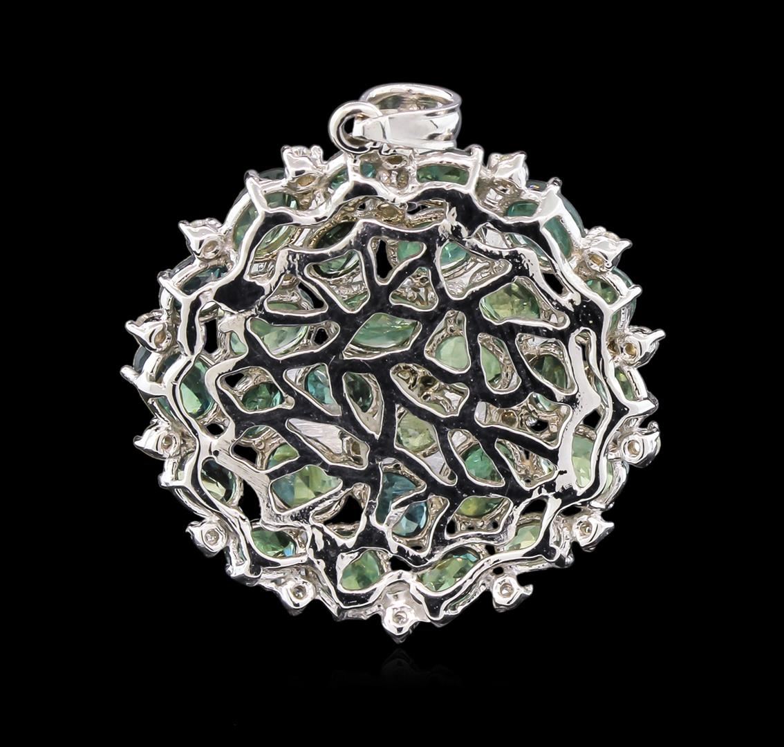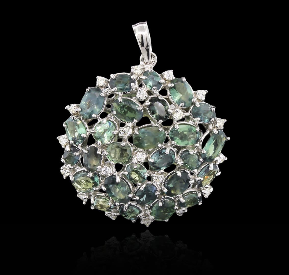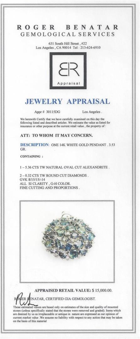 One 14KT white gold pendant weighing 3.53 grams containing: natural oval cut alexandrites with a total approximate weight of 5.36ct and round cut diamonds with a total approximate weight of 0.32ct. Diamonds: All SI clarity; G-H color. Fine cutting/proportions. RBGS Appraised at $15,000.00.