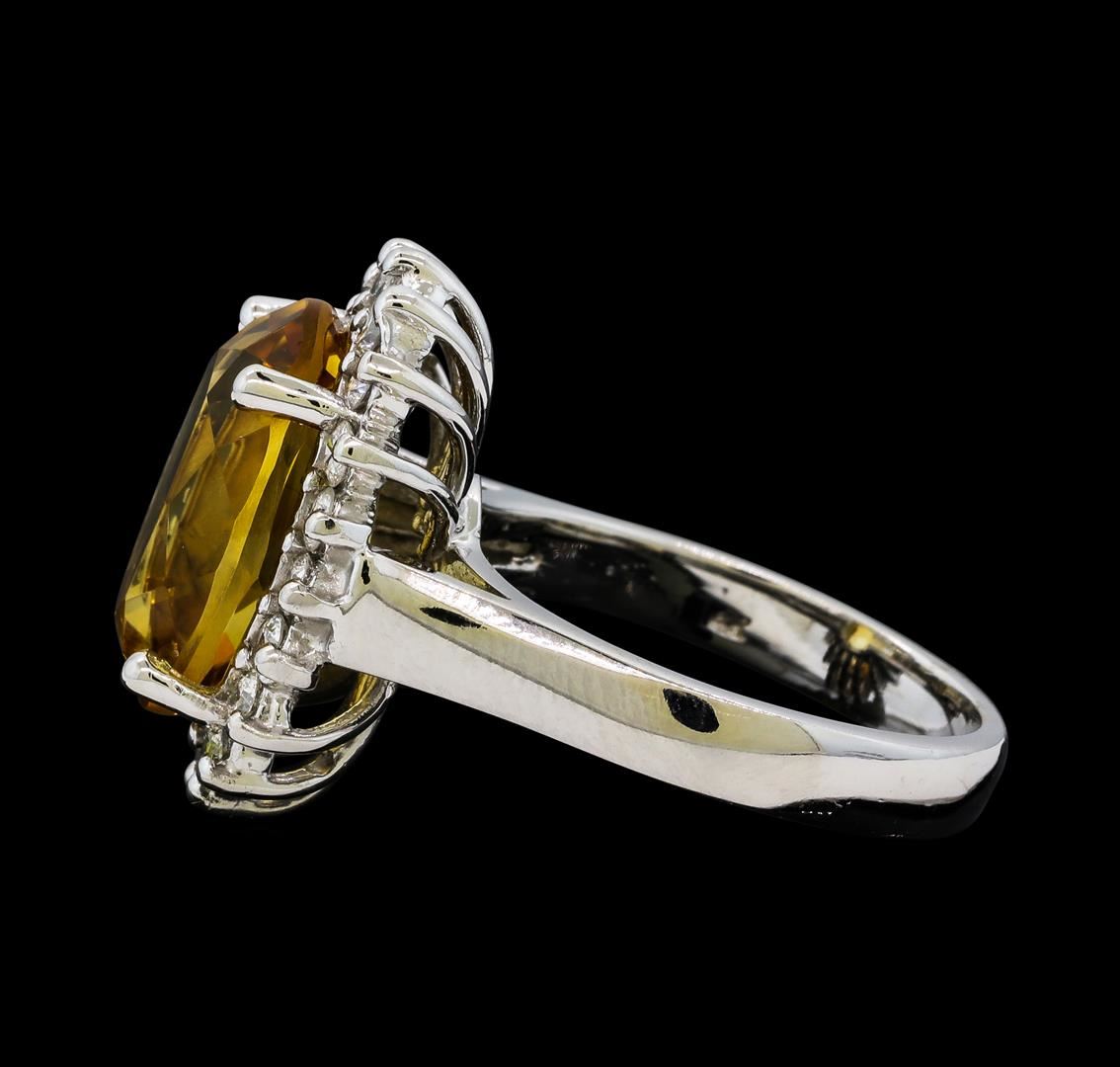 One Citrine Quartz and Diamond Ring including: 14KT White Gold weighing a total of 6.70 grams, Citrine Quartz weighing a total of 5.37ct and 20 Diamonds weighing a total of 0.62ctw.