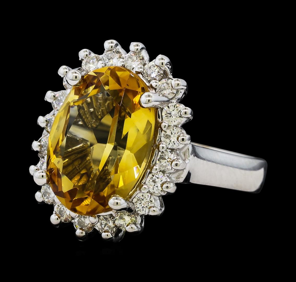 One Citrine Quartz and Diamond Ring including: 14KT White Gold weighing a total of 6.70 grams, Citrine Quartz weighing a total of 5.37ct and 20 Diamonds weighing a total of 0.62ctw.