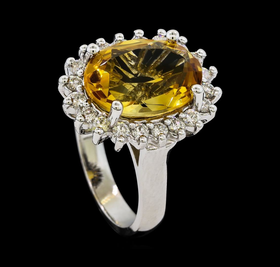 One Citrine Quartz and Diamond Ring including: 14KT White Gold weighing a total of 6.70 grams, Citrine Quartz weighing a total of 5.37ct and 20 Diamonds weighing a total of 0.62ctw.