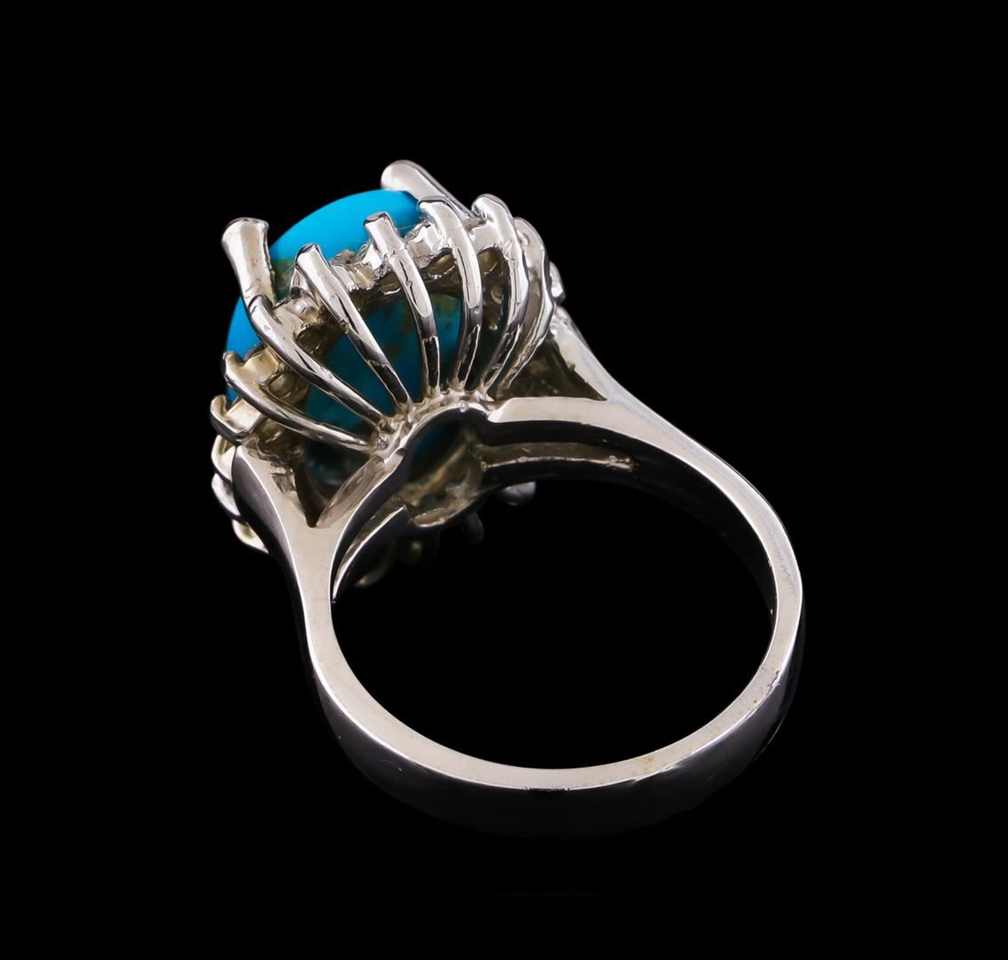 One ring featuring: 14KT white gold weighing 6.75 grams containing one turquoise center stone with a total weight of 5.37ct and diamonds with a total weight of 0.65ct.