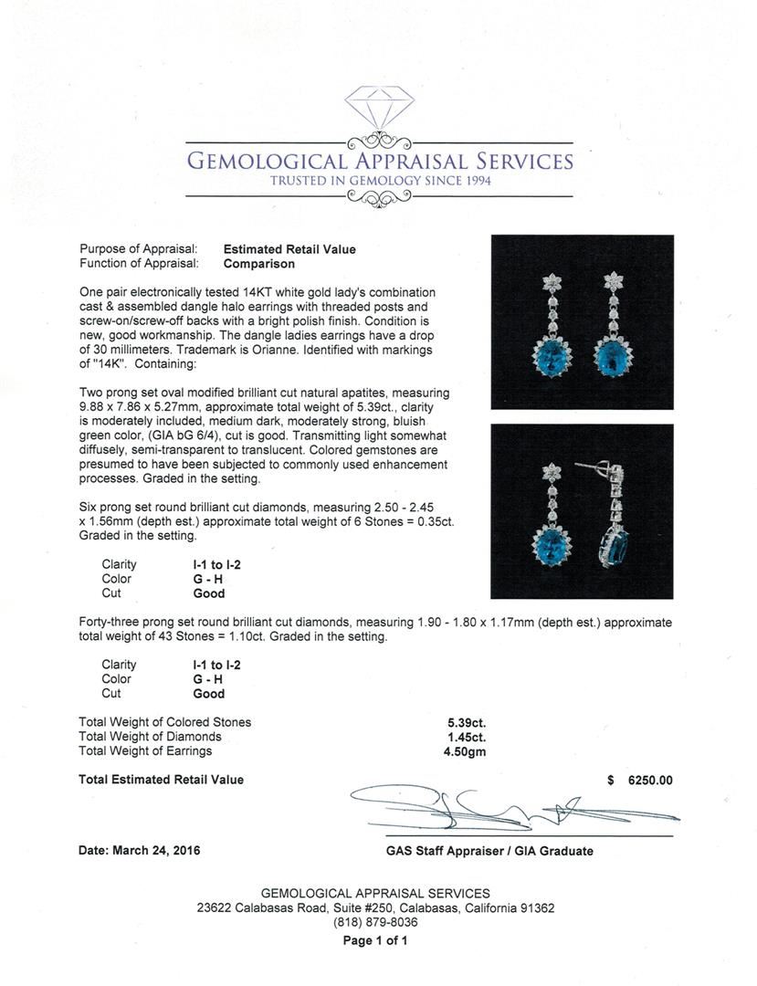 One pair electronically tested 14KT white gold lady's combination cast & assembled dangle halo earrings with threaded posts and screw-on/screw-off backs with a bright polish finish. The dangle ladies earrings have a drop of 30 millimeters. Trademark is Orianne. Identified with markings of "14K". Condition is new, good workmanship. Containing: Two prong set oval modified brilliant cut natural apatites, measuring 9.88 x 7.86 x 5.27mm, approximate total weight of 5.39ct., clarity is moderately included, medium dark, moderately strong, bluish green color, (GIA bG 6/4), cut is good. Transmitting light somewhat diffusely, semi-transparent to translucent. Colored gemstones are presumed to have been subjected to commonly used enhancement processes. Graded in the setting. Six prong set round brilliant cut diamonds, measuring 2.50 - 2.45 x 1.56mm (depth est.) approximate total weight of 6 Stones = 0.35ct. Graded in the setting. Clarity: I-1 to I-2. Color: G - H. Cut Good Forty-Three prong set round brilliant cut diamonds, measuring 1.90 - 1.80 x 1.17mm (depth est.) approximate total weight of 43 Stones = 1.10ct. Graded in the setting. Clarity: I-1 to I-2. Color: G - Good. Total Weight of Colored Stones 5.39ct. Total Weight of Diamonds 1.45ct. Total Weight of Earrings 4.50gm. GAS Appraised at $6,250.00.