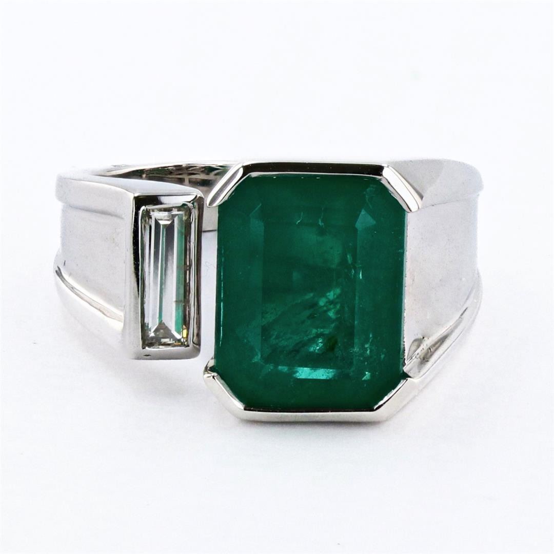 5.39ct Emerald and 0.30ct SI1 CLARITY Diamond 18K White Gold Ring. Eighteen karat (18K) white gold natural emerald beryl and diamond ring. An octagonal step cut natural emerald beryl gemstone is mounted in the center of the ring. A baguette cut diamond accents the ring on one side of the center gemstone. The ring has a gross weight of 9.3 Grams. NATURAL GEMSTONE GEMSTONE: Emerald Beryl NATURE: Natural SHAPE: Octagonal Step, Faceted Cut WEIGHT: 5.39 carat total DIMENSIONS: 11.52 x 8.87mm CLARITY: Type 3 COLOR: Green (5/5) SYMMETRY: Excellent COLOR INTENSITY: Intense TRANSPARENCY: Transparent TONE: Dark NATURAL DIAMOND SHAPE: Baguette Cut WEIGHT: 0.30 carat total (lpc.) DIMENSIONS: 6.95 x 2.02mm AVERAGE CLARITY: SI1 AVERAGE COLOR: G SYMMETRY: Excellent POLISH: Excellent METAL METAL: Gold PURITY: 18K (750) COLOR: White CONDITION: Excellent FINISH: High Polish