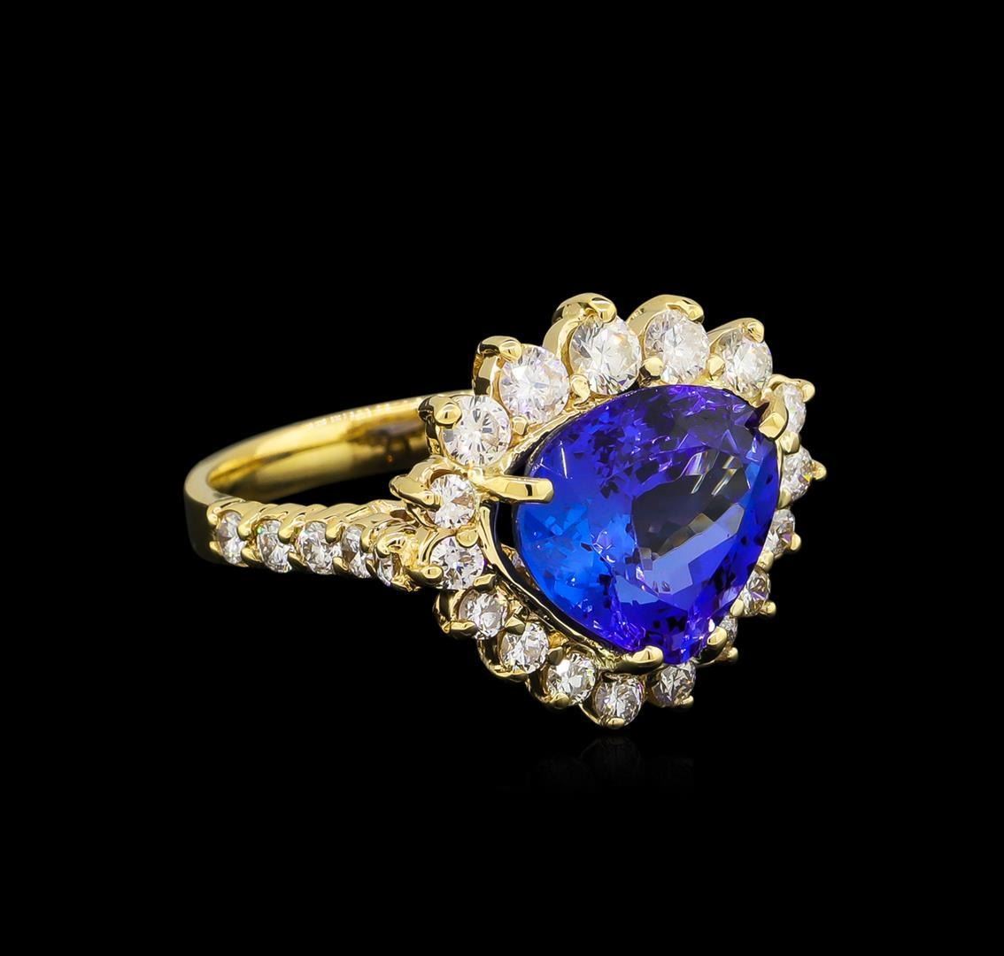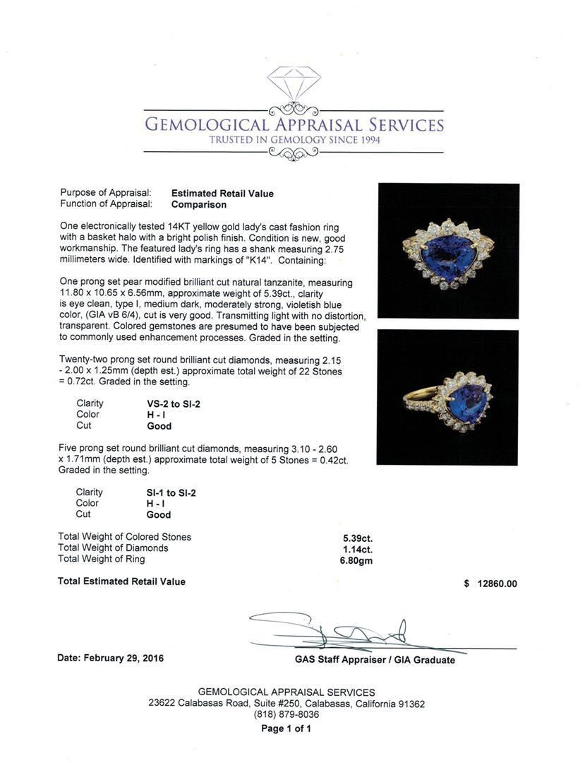 One electronically tested 14KT yellow gold lady's cast fashion ring with a basket halo with a bright polish finish. The featured lady's ring has a shank measuring 2.75 millimeters wide. Identified with markings of "K14". Condition is new, good workmanship. Containing: One prong set pear modified brilliant cut natural tanzanite, measuring 11.80 x 10.65 x 6.56mm, approximate weight of 5.39ct., clarity is eye clean, type I, medium dark, moderately strong, violetish blue color, (GIA vB 6/4), cut is very good. Transmitting light with no distortion, transparent. Colored gemstones are presumed to have been subjected to commonly used enhancement processes. Graded in the setting. Twenty-Two prong set round brilliant cut diamonds, measuring 2.15 - 2.00 x 1.25mm (depth est.) approximate total weight of 22 Stones = 0.72ct. Graded in the setting. Clarity: VS-2 to SI-2. Color: H - I. Cut Good Five prong set round brilliant cut diamonds, measuring 3.10 - 2.60 x 1.71mm (depth est.) approximate total weight of 5 Stones = 0.42ct. Graded in the setting. Clarity: SI-1 to SI-2. Color: H - I. Cut Good. Total Weight of Colored Stones 5.39ct. Total Weight of Diamonds 1.14ct. Total Weight of Ring 6.80gm. GAS Appraised.