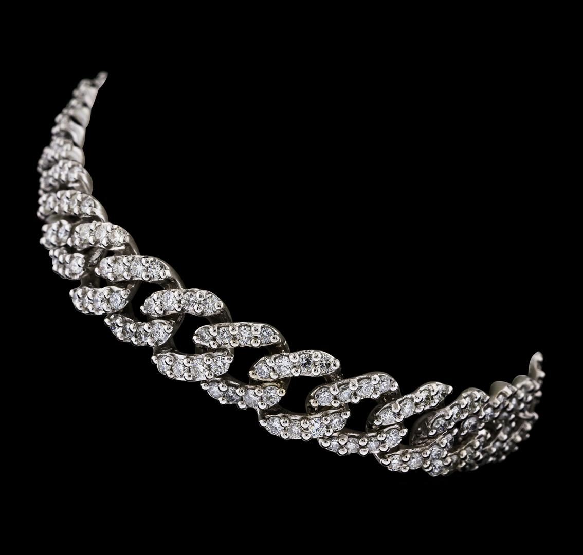 One electronically tested 14KT white gold lady's combination cast & assembled fashion bracelet with a tongue clasp with foldover safety with a bright polish finish. The featured lady's bracelet is a diamond set curb link chain and measures approximately 9.5 millimeters wide and 7 inches long. Identified with markings of 'K14'. Condition is new, good workmanship. Containing: Two Hundred Forty-Eight prong set round brilliant cut diamonds, measuring 1.85 - 1.75 x 1.10mm (depth est.) approximate total weight of 248 Stones = 5.40ct. Graded in the setting. Clarity SI-1 to SI-3. Color: G - I Cut Good. Total Weight of Diamonds 5.40ct.. Total Weight of Bracelet 24.50gm. GAS Appraised at $16,885.00.