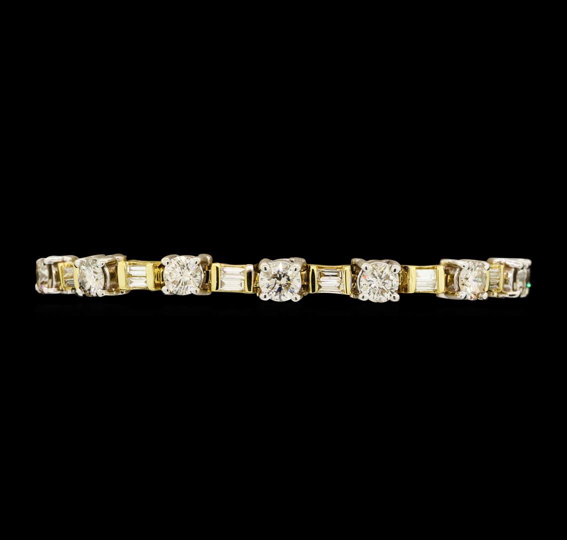 One electronically tested 14KT yellow and white gold lady's combination cast & assembled fashion bracelet with a tongue clasp with foldover safety with a bright polish finish. The featured lady's bracelet measures approximately 6.5 inches in length. Identified with markings of '14K'. Condition is new, good workmanship. Containing: Fifteen prong set round brilliant cut diamonds, measuring 4.40 - 4.00 x 2.60mm (depth est.) approximate total weight of 15 Stones = 4.20ct. Graded in the setting. Color I - J Clarity SI-1 to SI-2 Cut Good Thirty channel set baguette cut diamonds, measuring from 3.10 x 1.20 x 1.02mm (depth est.) to 3.20 x 1.35 x 1.15mm (depth est.) approximate total weight of 30 Stones = 1.20ct. Graded in the setting. Color H - I Clarity VS-2 to SI-1 Cut Very Good. Total Weight of Diamonds 5.40ct.. Total Weight of Bracelet 13.50gm. GAS Appraised at $18,485.00.