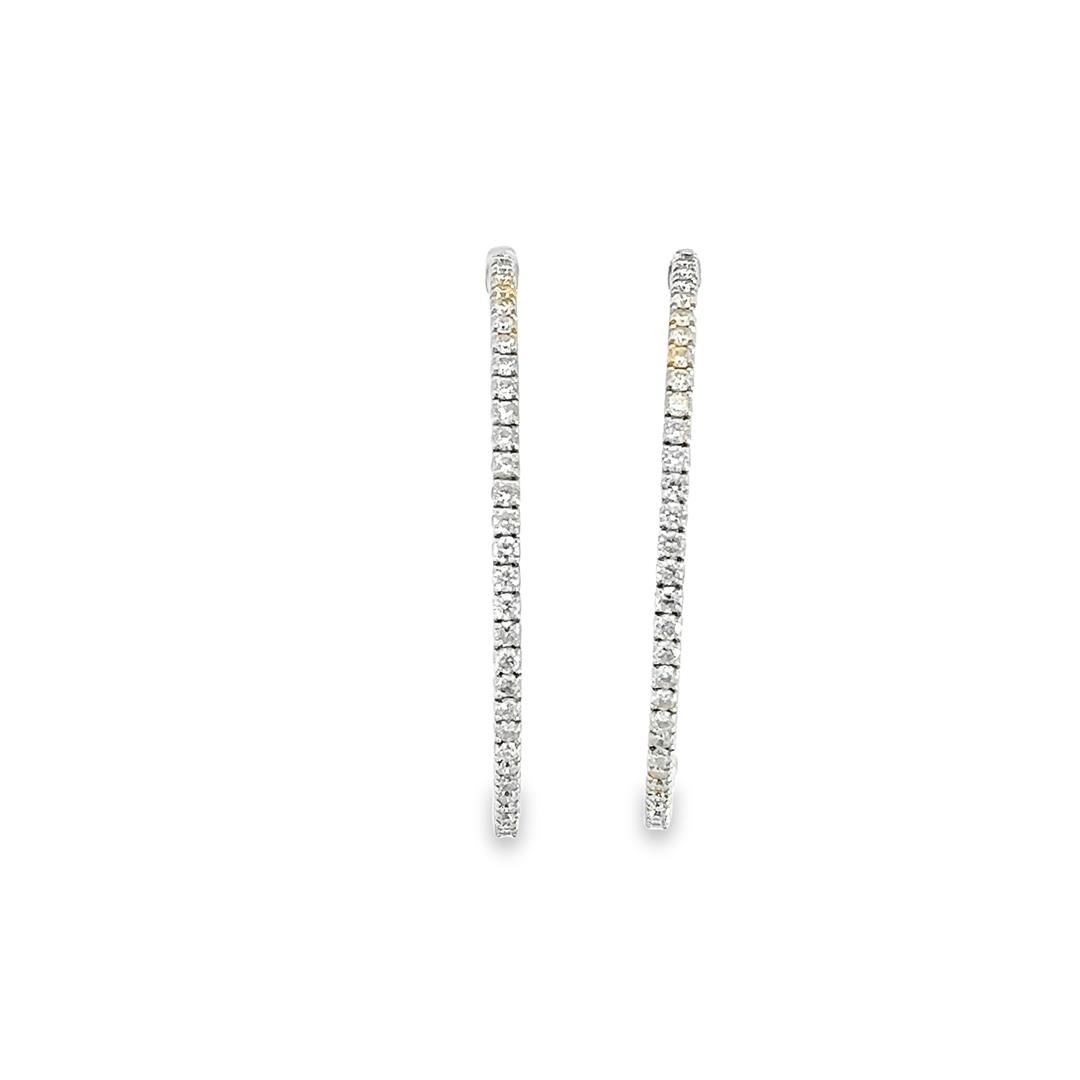 One pair electronically tested 14KT white gold lady's combination cast & assembled fashion inside-out hoop earrings with hinged, snap locking posts with a bright polish finish. The featured hoop earring has a diameter of 57.00 millimeter. Identified with markings of "14K". Condition is new, good workmanship. Containing: One Hundred Thirty-Eight prong set round brilliant cut diamonds, measuring 2.20 - 2.10 x 1.38mm (depth est.) approximate total weight of 138 Stones = 5.40ct. Graded in the setting. Color I - J Clarity VS-2 to SI-1 Cut Very Good Total Weight of Diamonds 5.40ct. Total Weight of Earrings 16.10gm Estimated Retail Value $ 19300.00