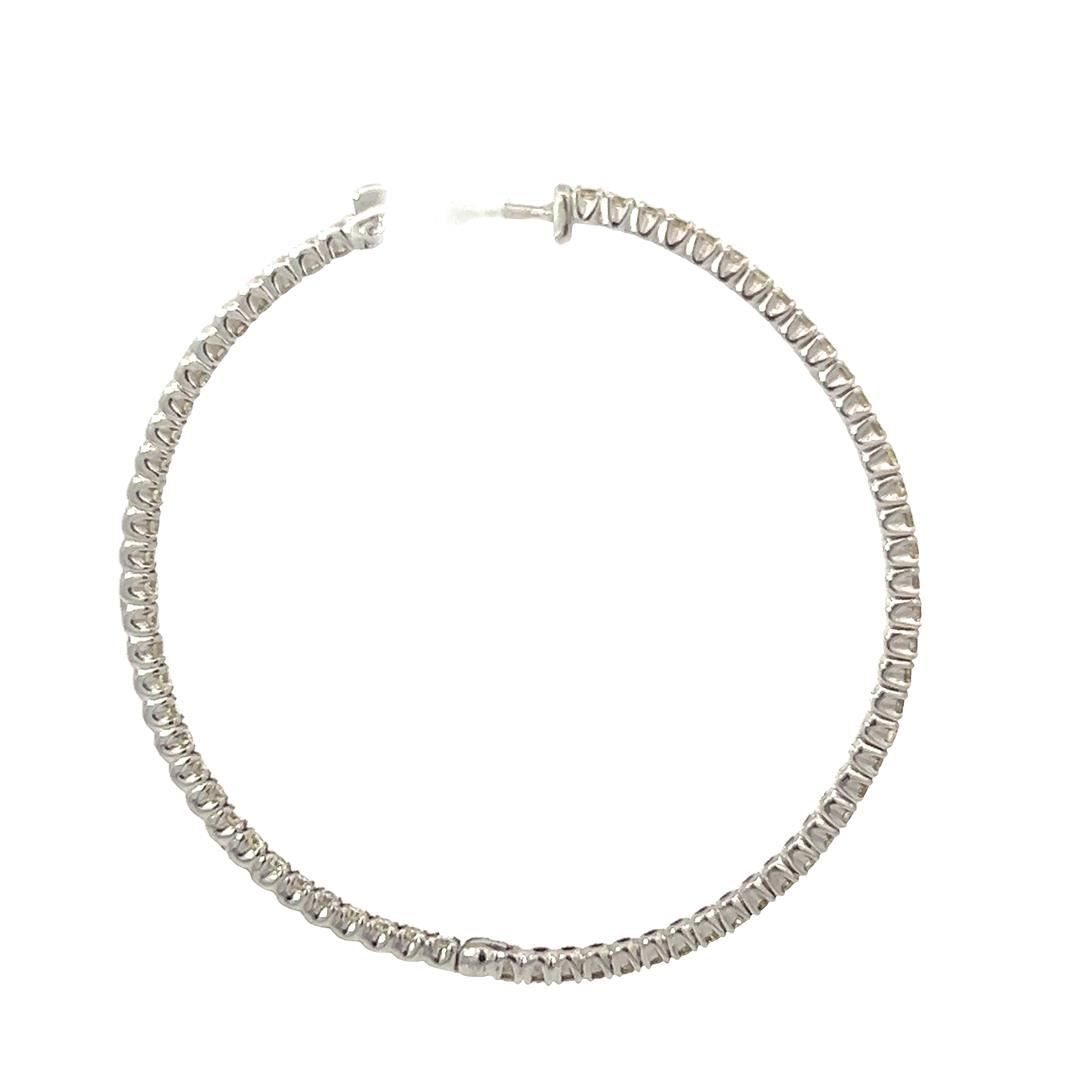 One pair electronically tested 14KT white gold lady's combination cast & assembled fashion inside-out hoop earrings with hinged, snap locking posts with a bright polish finish. The featured hoop earring has a diameter of 57.00 millimeter. Identified with markings of "14K". Condition is new, good workmanship. Containing: One Hundred Thirty-Eight prong set round brilliant cut diamonds, measuring 2.20 - 2.10 x 1.38mm (depth est.) approximate total weight of 138 Stones = 5.40ct. Graded in the setting. Color I - J Clarity VS-2 to SI-1 Cut Very Good Total Weight of Diamonds 5.40ct. Total Weight of Earrings 16.10gm Estimated Retail Value $ 19300.00