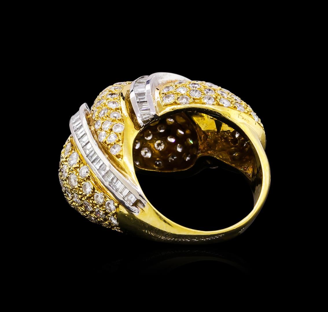 One electronically tested 18KT yellow gold ladies cast diamond ring. The ring features three diamond curvatures with baguette diamond ribbon accents supported by tapering shoulders, completed by a four millimeter wide band. Bright polish finish with rhodium accents. Identified with markings of "18K". Condition is good. Containing: Forty-Three channel set baguette cut (tapered) diamonds, measuring from 2.00 x 1.50 x 1.05mm (depth est.) to 2.10 x 1.80 x 1.26mm (depth est.) approximate total weight of 43 Stones = 1.54ct. Graded in the setting. Clarity: VS-1 to VS-2. Color: E - G One Hundred Forty-Three prong set round brilliant cut diamonds, measuring 2.40 - 1.50 x 1.17mm (depth est.) approximate total weight of 143 Stones = 3.86ct. Graded in the setting. Clarity: SI-1 to SI-2. Color: D - F. Total Weight of Diamonds 5.40ct. Total Weight of Ring 22.69gm. AIG Appraised at $24,360.00.