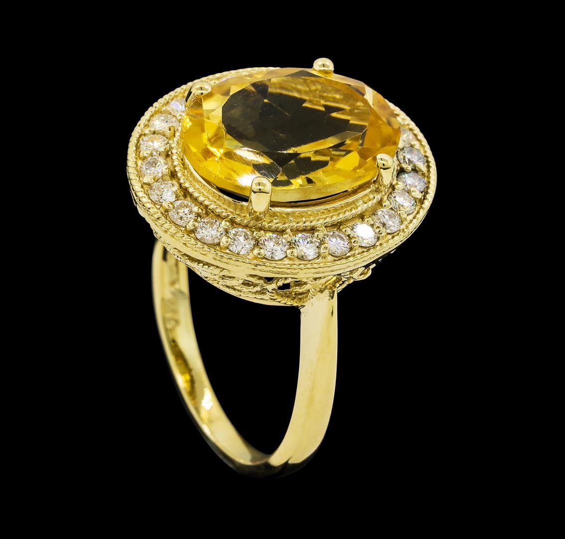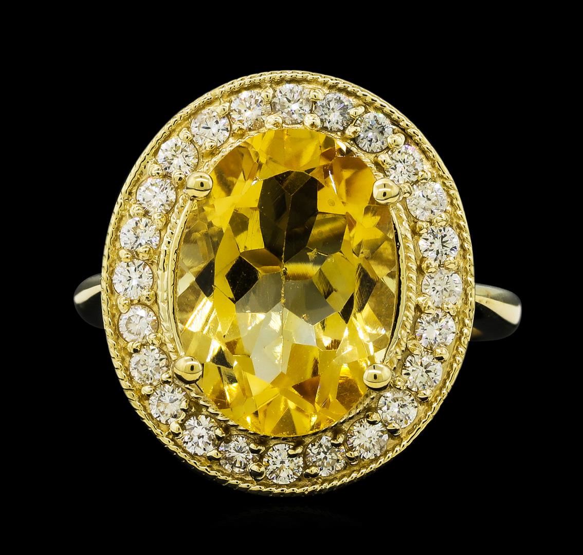 One Citrine Quartz and Diamond Ring including: 14KT Yellow Gold weighing a total of 5.99 grams, Citrine Quartz weighing a total of 5.41ct and 24 Diamonds weighing a total of 0.60ctw.