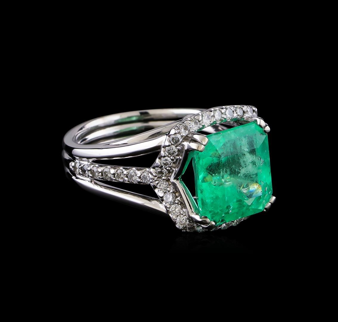 One electronically tested 14KT white gold lady's cast fashion ring with a split shank basket halo with a bright polish finish. The featured lady's ring has a triple shank measuring 4.5 millimeters in width. Identified with markings of "14K". Condition is new, good workmanship. Containing: One prong set square emerald step cut natural emerald, measuring 10.78 x 10.45 x 7.78mm, (depth est.) approximate weight of 5.42ct., clarity is heavily included, medium light, moderately strong, green color, (GIA G 4/4), cut is good. Transmitting light somewhat diffusely, transparent to translucent. Colored gemstones are presumed to have been subjected to commonly used enhancement processes. Indications of oil residue. Naturally occurring internal & external characteristics are present. Graded in the setting. Forty-Four prong set round brilliant cut diamonds, measuring 1.57 - 1.52 x 0.97mm (depth est.) approximate total weight of 44 Stones = 0.62ct. Graded in the setting. Clarity: SI-1 to SI-2. Color: H - I. Cut Good. Total Weight of Colored Stones 5.42ct. Total Weight of Diamonds 0.62ct. Total Weight of Ring 8.60gm. GAS Appraised at $11,050.00.