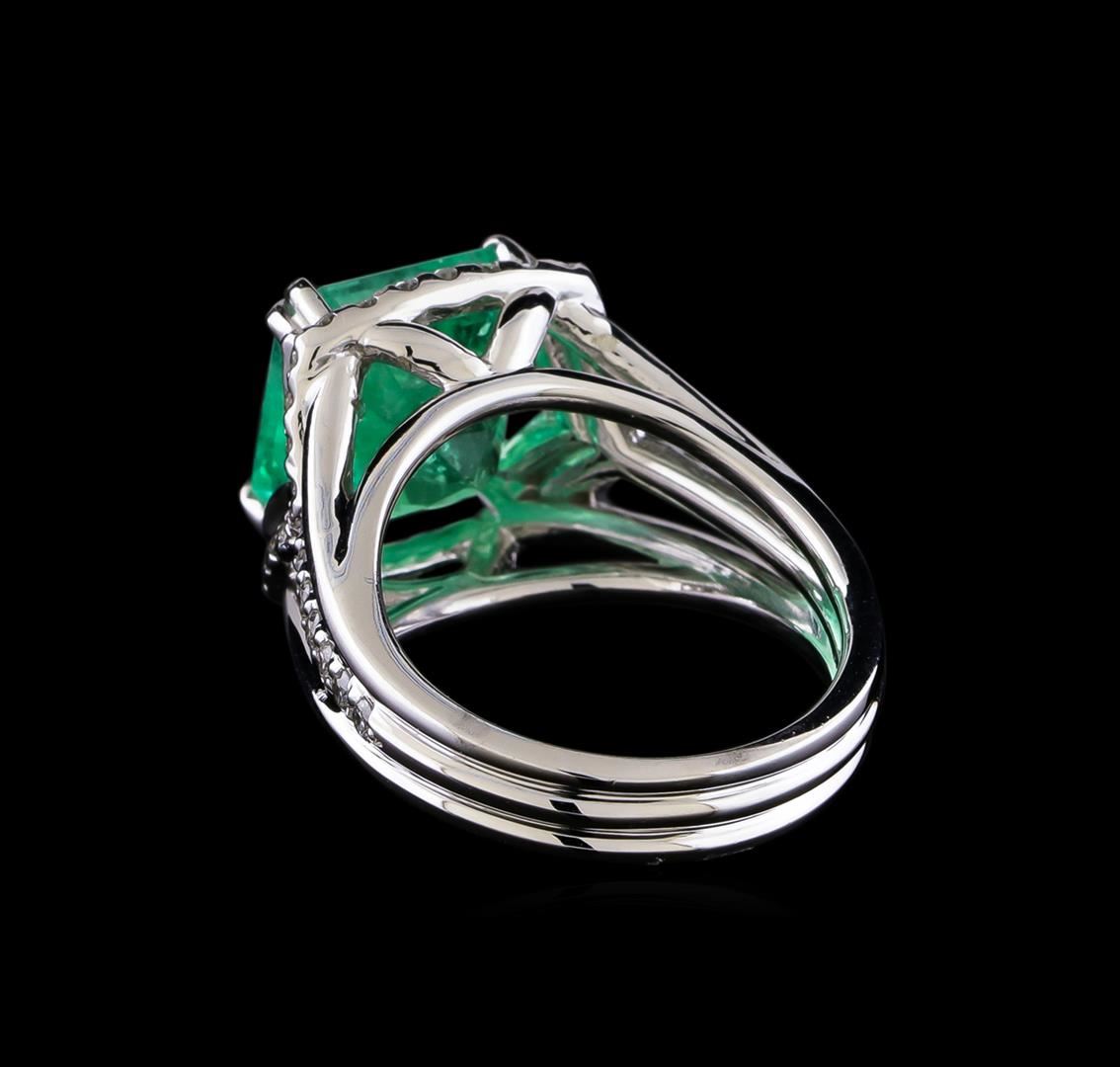 One electronically tested 14KT white gold lady's cast fashion ring with a split shank basket halo with a bright polish finish. The featured lady's ring has a triple shank measuring 4.5 millimeters in width. Identified with markings of "14K". Condition is new, good workmanship. Containing: One prong set square emerald step cut natural emerald, measuring 10.78 x 10.45 x 7.78mm, (depth est.) approximate weight of 5.42ct., clarity is heavily included, medium light, moderately strong, green color, (GIA G 4/4), cut is good. Transmitting light somewhat diffusely, transparent to translucent. Colored gemstones are presumed to have been subjected to commonly used enhancement processes. Indications of oil residue. Naturally occurring internal & external characteristics are present. Graded in the setting. Forty-Four prong set round brilliant cut diamonds, measuring 1.57 - 1.52 x 0.97mm (depth est.) approximate total weight of 44 Stones = 0.62ct. Graded in the setting. Clarity: SI-1 to SI-2. Color: H - I. Cut Good. Total Weight of Colored Stones 5.42ct. Total Weight of Diamonds 0.62ct. Total Weight of Ring 8.60gm. GAS Appraised at $11,050.00.