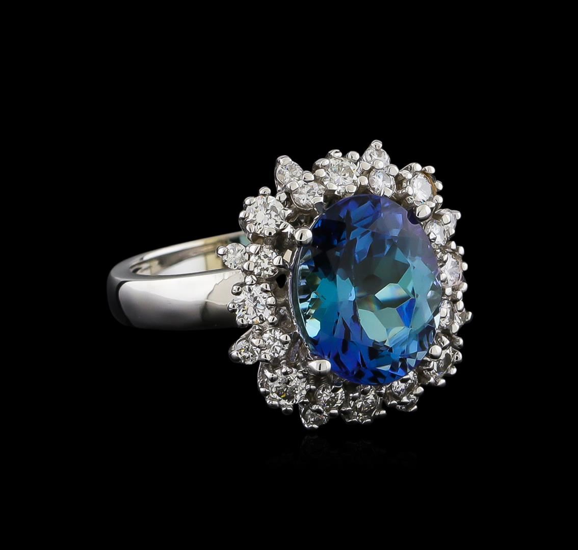 One electronically tested 14KT white gold lady's cast fashion ring with a basket double halo with a bright polish finish. The featured lady's ring has a shank measuring 2.93 millimeters wide. Identified with markings of "14K". Condition is new, good workmanship. Containing: One prong set oval modified brilliant cut natural tanzanite, measuring 11.97 x 9.85 x 6.74mm, approximate weight of 5.42ct., clarity is eye clean, type I, medium, moderately strong, bluish violet color, (GIA bV 5/4), cut is very good. The featured tanzanite has a slight green overtone. Transmitting light with no distortion, transparent. Colored gemstones are presumed to have been subjected to commonly used enhancement processes. Graded in the setting. Eight prong set round brilliant cut diamonds, measuring 2.60 - 2.50 x 1.58mm (depth est.) approximate total weight of 8 Stones = 0.50ct. Graded in the setting. Clarity: VS-2 to SI-2. Color: H - I. Cut Very Good Sixteen prong set round brilliant cut diamonds, measuring 1.90 - 1.60 x 1.09mm (depth est.) approximate total weight of 16 Stones = 0.33ct. Graded in the setting. Clarity: SI-1 to SI-2. Color: H - I. Cut Good. Total Weight of Colored Stones 5.42ct. Total Weight of Diamonds 0.83ct. Total Weight of Ring 6.80gm. GAS Appraised at $11,415.00.