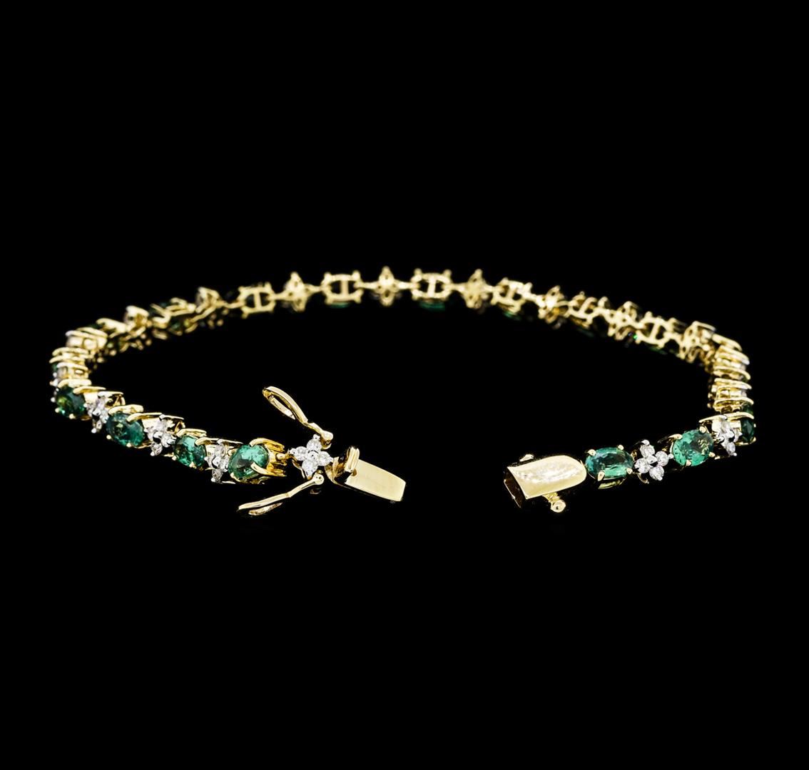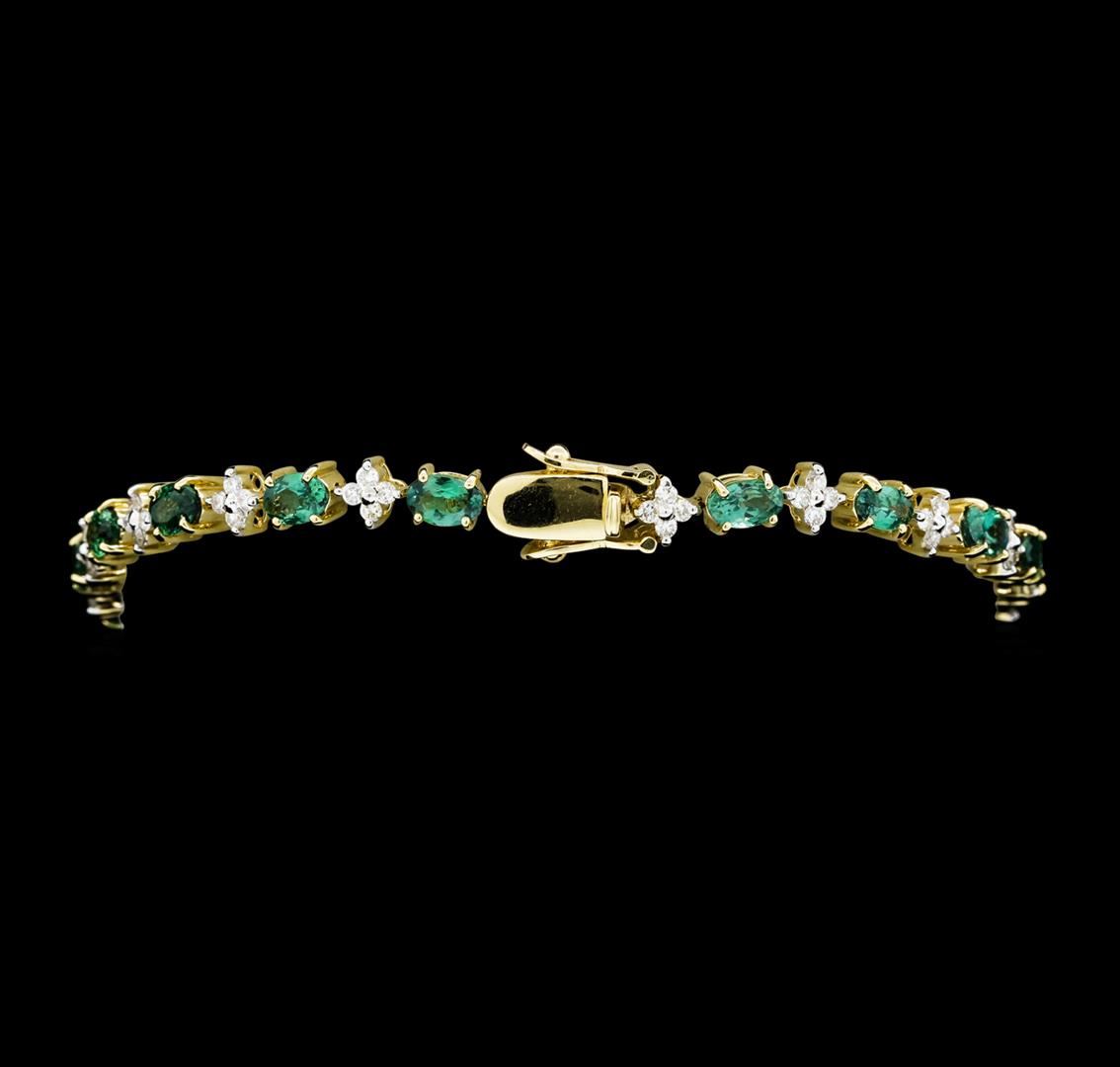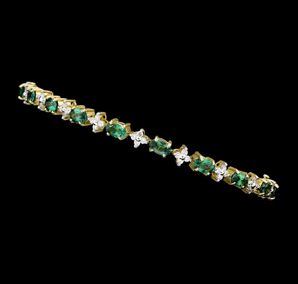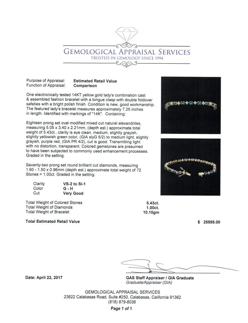One electronically tested 14KT yellow gold lady's combination cast & assembled fashion bracelet with a tongue clasp with double foldover safeties with a bright polish finish. The featured lady's bracelet measures approximately 7.25 inches in length. Identified with markings of '14K'. Condition is new, good workmanship. Containing: Eighteen prong set oval modified mixed cut natural alexandrites, measuring 5.05 x 3.40 x 2.21mm, (depth est.) approximate total weight of 5.43ct., clarity is eye clean, medium, slightly grayish, slightly yellowish green color, (GIA slyG 5/2) to medium light, slightly grayish, purple red, (GIA PR 4/2), cut is good. Transmitting light with no distortion, transparent. Colored gemstones are presumed to have been subjected to commonly used enhancement processes. Graded in the setting. Seventy-Two prong set round brilliant cut diamonds, measuring 1.60 - 1.50 x 0.96mm (depth est.) approximate total weight of 72 Stones = 1.00ct. Graded in the setting. Color G - H Clarity VS-2 to SI-1 Cut Very Good. Total Weight of Colored Stones 5.43ct.. Total Weight of Diamonds 1.00ct.. Total Weight of Bracelet 10.10gm GAS Appraised at $25595.00. GAS Appraised at $25,595.00.