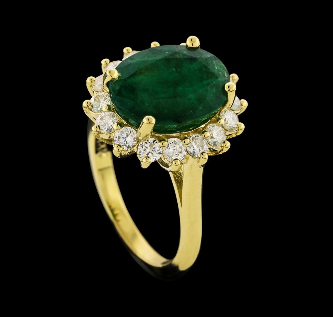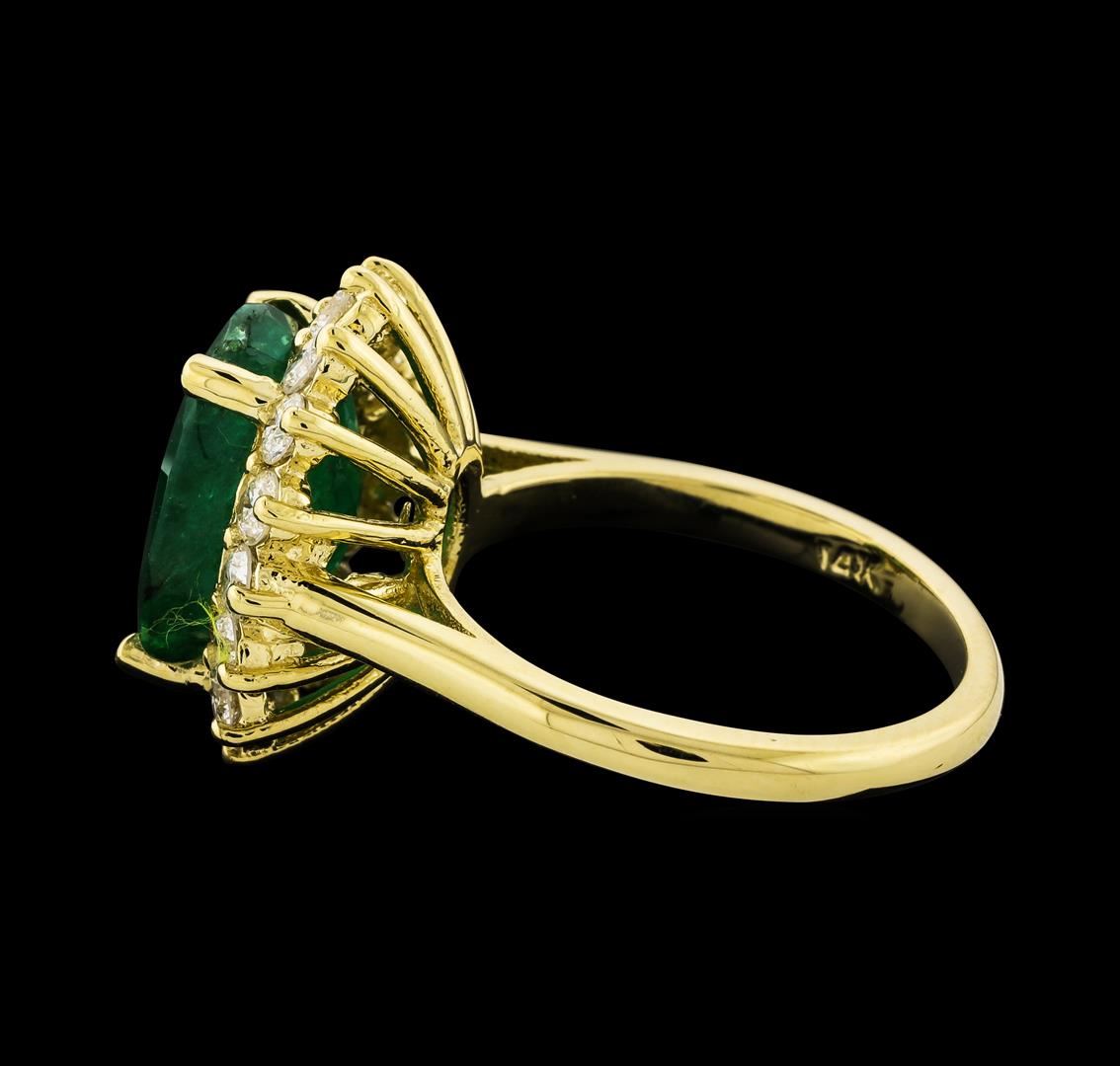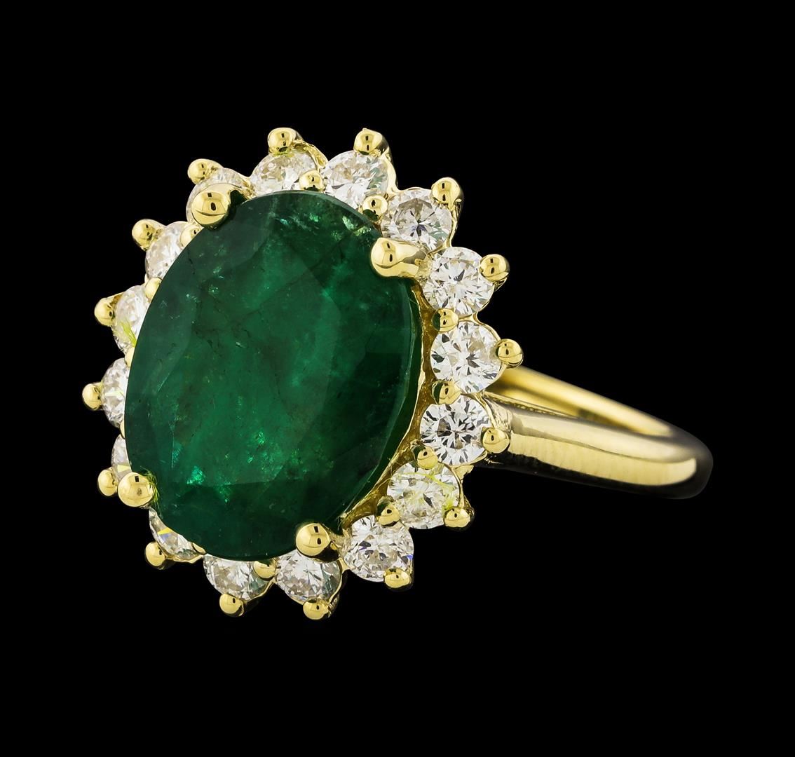 One electronically tested 14KT yellow gold lady's cast fashion ring with a cathedral shank with a basket halo with a bright polish finish. The featured lady's ring has a shank measuring 1.97 millimeters wide. Identified with markings of '14K'. Condition is new, good workmanship. Containing: One prong set oval modified mixed cut natural emerald, measuring 12.94 x 10.04 x 6.13mm, (depth est.) 20%. bulge factor, approximate weight of 5.43ct., clarity is heavily included, medium, moderately strong, green color, (GIA G 5/4), cut is good. Transmitting light somewhat diffusely, semi-transparent to translucent. Naturally occurring internal & external characteristics are present. Indications of oil residue. Colored gemstones are presumed to have been subjected to commonly used enhancement processes. Graded in the setting. Sixteen prong set round brilliant cut diamonds, measuring 2.50 - 2.40 x 1.52mm (depth est.) approximate total weight of 16 Stones = 0.90ct. Graded in the setting. Clarity SI-1 to SI-2. Color: H - I Cut Good. Total Weight of Colored Stones 5.43ct.. Total Weight of Diamonds 0.90ct.. Total Weight of Ring 6.10gm. GAS Appraised at $7,395.00.