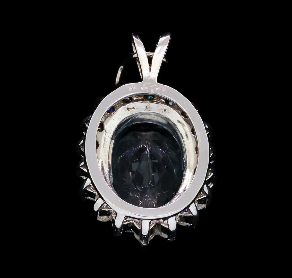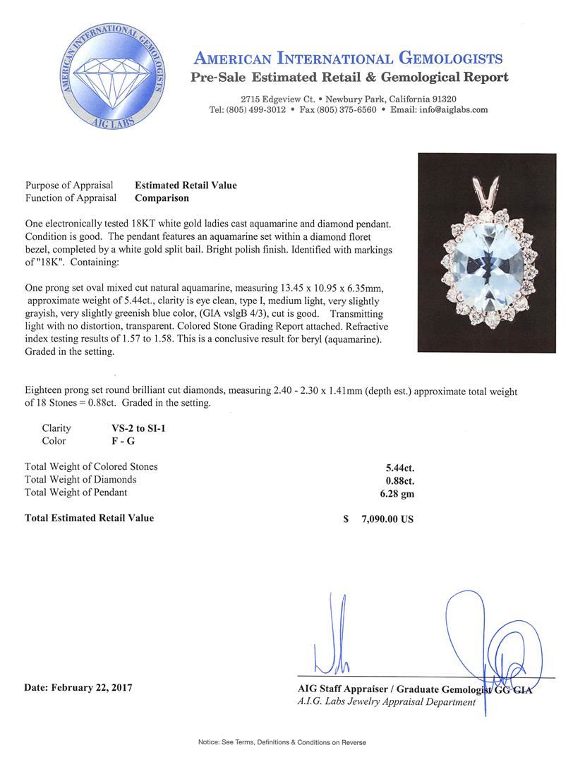 One electronically tested 18KT white gold ladies cast aquamarine and diamond pendant. The pendant features an aquamarine set within a diamond floret bezel, completed by a white gold split bail. Bright polish finish. Identified with markings of '18K'. Condition is good. Containing: One prong set oval mixed cut natural aquamarine, measuring 13.45 x 10.95 x 6.35mm, approximate weight of 5.44ct., clarity is eye clean, type I, medium light, very slightly grayish, very slightly greenish blue color, (GIA vslgB 4/3), cut is good. Transmitting light with no distortion, transparent. Colored Stone Grading Report attached. Refractive index testing results of 1.57 to 1.58. This is a conclusive result for beryl (aquamarine). Graded in the setting. Eighteen prong set round brilliant cut diamonds, measuring 2.40 - 2.30 x 1.41mm (depth est.) approximate total weight of 18 Stones = 0.88ct. Graded in the setting. Clarity VS-2 to SI-1. Color: F - G. Total Weight of Colored Stones 5.44ct.. Total Weight of Diamonds 0.88ct.. Total Weight of Pendant 6.28gm. AIG Appraised at $7,090.00.