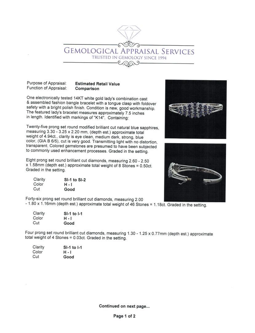 One electronically tested 14KT white gold lady's combination cast & assembled fashion bangle bracelet with a tongue clasp with foldover safety with a bright polish finish. The featured lady's bracelet measures approximately 7.5 inches in length. Identified with markings of 'K14'. Condition is new, good workmanship. Containing: Twenty-five prong set round modified brilliant cut natural blue sapphires, measuring 3.30 - 3.25 x 2.20 mm, (depth est.) approximate total weight of 4.94ct., clarity is eye clean, medium dark, strong, blue color, (GIA B 6/5), cut is very good. Transmitting light with no distortion, transparent. Colored gemstones are presumed to have been subjected to commonly used enhancement processes. Graded in the setting. Eight prong set round brilliant cut diamonds, measuring 2.60 - 2.50 x 1.58mm (depth est.) approximate total weight of 8 Stones = 0.50ct. Graded in the setting. Clarity SI-1 to SI-2. Color: H - I Cut Good Forty-Six prong set round brilliant cut diamonds, measuring 2.00 - 1.80 x 1.16mm (depth est.) approximate total weight of 46 Stones = 1.18ct. Graded in the setting. Clarity SI-1 to I-1. Color: H - I Cut Good Four prong set round brilliant cut diamonds, measuring 1.30 - 1.25 x 0.77mm (depth est.) approximate total weight of 4 Stones = 0.03ct. Graded in the setting. Clarity SI-1 to I-1. Color: H - I Cut Good. Total Weight of Colored Stones 4.94ct.. Total Weight of Diamonds 1.71ct.. Total Weight of Bangle Bracelet 24.70gm. GAS Appraised at $9,315.00.