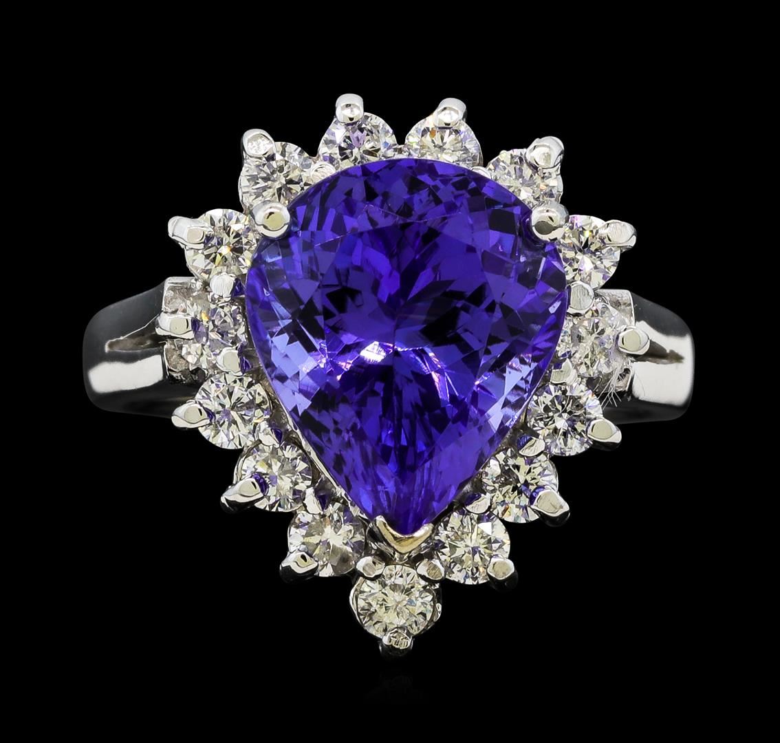 One electronically tested 14KT white gold lady's cast fashion ring with a basket halo with a bright polish finish. The featured lady's ring has a shank measuring 2.60 millimeters wide. Identified with markings of '14K'. Condition is new, good workmanship. Containing: One prong set pear modified brilliant cut natural tanzanite, measuring 11.74 x 9.77 x 7.63mm, (depth est.) approximate weight of 5.44ct., clarity is eye clean, medium dark, moderately strong, violet color, (GIA V 6/4), cut is very good. Transmitting light with no distortion, transparent. Colored gemstones are presumed to have been subjected to commonly used enhancement processes. Graded in the setting. Fifteen prong set round brilliant cut diamonds, measuring 2.40 - 2.35 x 1.45mm (depth est.) approximate total weight of 15 Stones = 0.75ct. Graded in the setting. Clarity SI-1 to I-1. Color: G - H Cut Good. Total Weight of Colored Stones 5.44ct.. Total Weight of Diamonds 0.75ct.. Total Weight of Ring 7.00gm. GAS Appraised at $11,390.00.