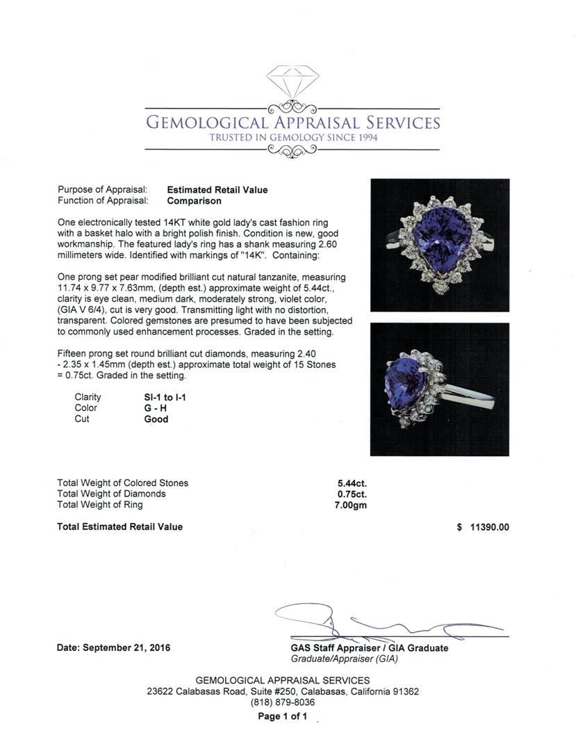 One electronically tested 14KT white gold lady's cast fashion ring with a basket halo with a bright polish finish. The featured lady's ring has a shank measuring 2.60 millimeters wide. Identified with markings of '14K'. Condition is new, good workmanship. Containing: One prong set pear modified brilliant cut natural tanzanite, measuring 11.74 x 9.77 x 7.63mm, (depth est.) approximate weight of 5.44ct., clarity is eye clean, medium dark, moderately strong, violet color, (GIA V 6/4), cut is very good. Transmitting light with no distortion, transparent. Colored gemstones are presumed to have been subjected to commonly used enhancement processes. Graded in the setting. Fifteen prong set round brilliant cut diamonds, measuring 2.40 - 2.35 x 1.45mm (depth est.) approximate total weight of 15 Stones = 0.75ct. Graded in the setting. Clarity SI-1 to I-1. Color: G - H Cut Good. Total Weight of Colored Stones 5.44ct.. Total Weight of Diamonds 0.75ct.. Total Weight of Ring 7.00gm. GAS Appraised at $11,390.00.
