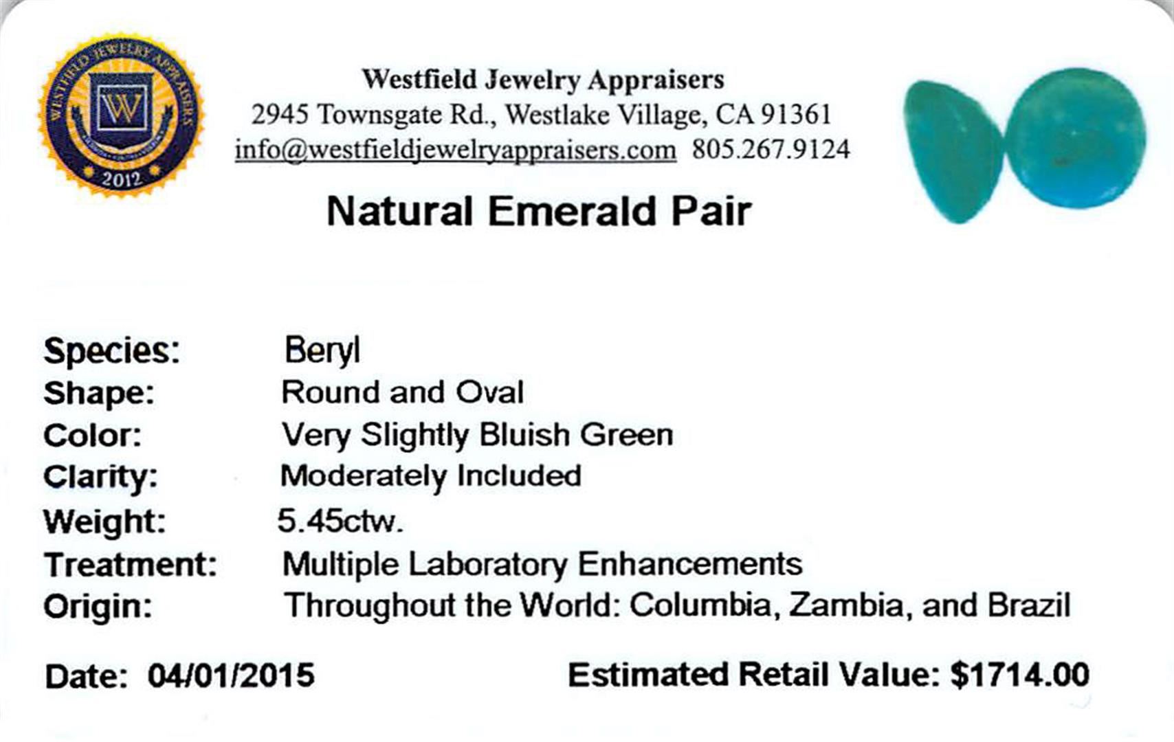 Two oval and round mixed cut natural emeralds exact total weight 5.45ct., clarity is moderately included, type III, medium dark, very slightly grayish, very slightly bluish green color, (GIA vslbG 6/3), cut is good. Westfield Appraised.