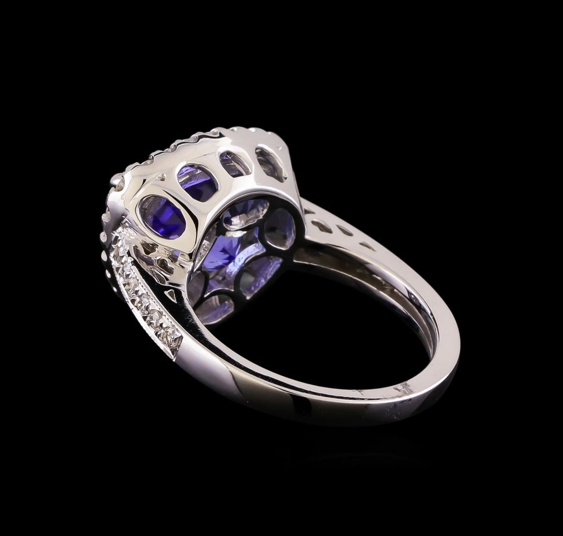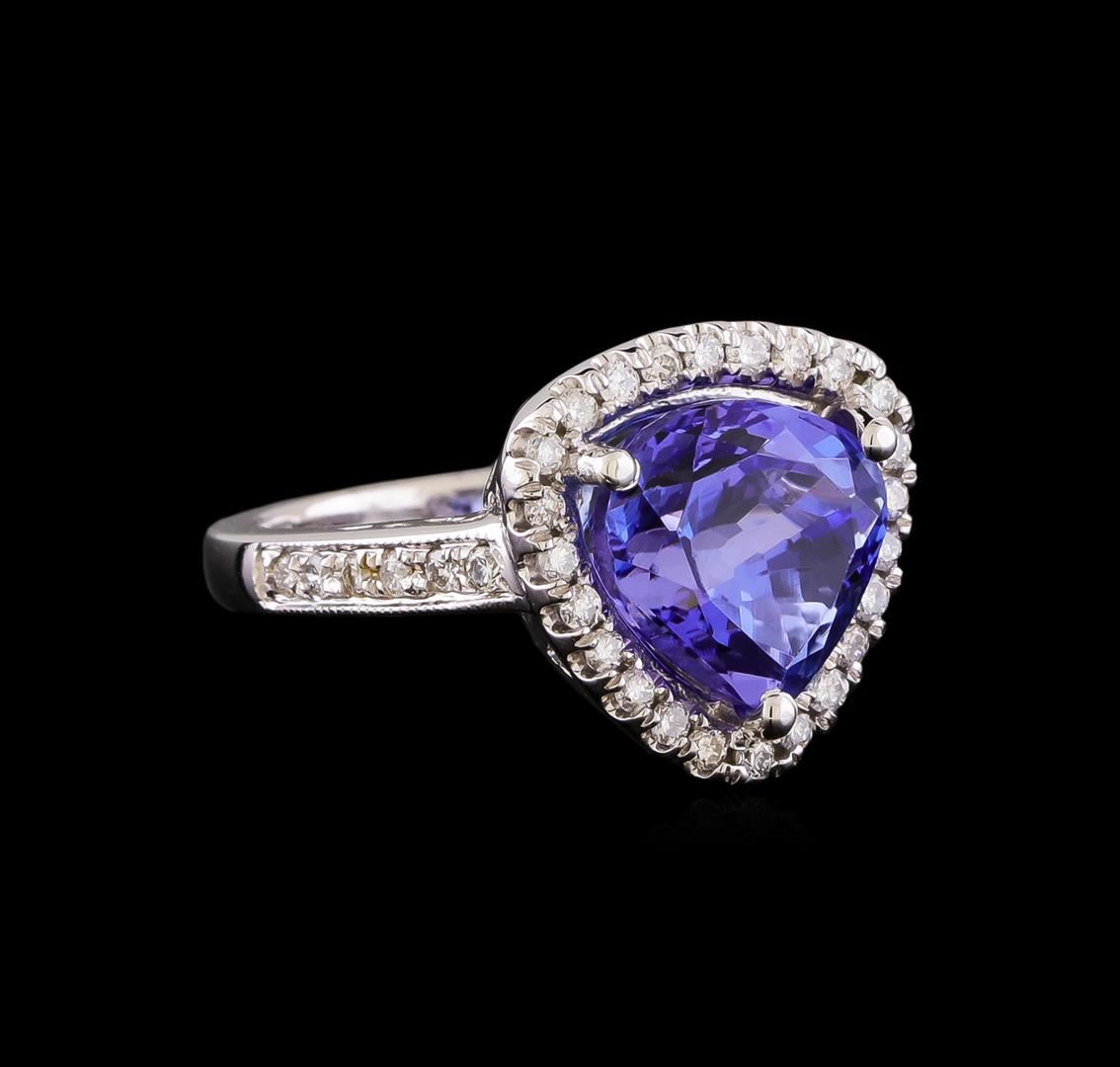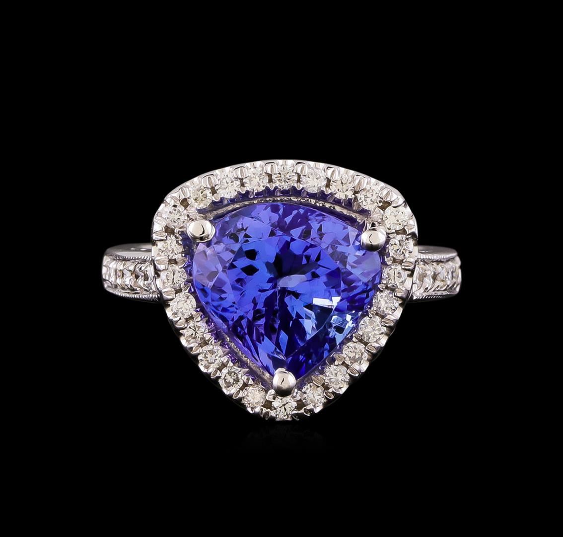 One electronically tested 14KT white gold lady's cast fashion ring with a halo with a bright polish with milgrain detailing finish. The featured lady's ring has a shank measuring 2.26 millimeters wide. Identified with markings of "14K". Condition is new, good workmanship. Containing: One prong set pear modified brilliant cut natural tanzanite, measuring 10.20 x 10.60 x 7.91mm, (depth est.) approximate weight of 5.48ct., clarity is eye clean, medium, moderately strong, violetish blue color, (GIA vB 5/4), cut is very good. Transmitting light with no distortion, transparent. Colored gemstones are presumed to have been subjected to commonly used enhancement processes. Graded in the setting. Thirty-Six prong set round brilliant cut diamonds, measuring 1.55 - 1.45 x 0.93mm (depth est.) approximate total weight of 36 Stones = 0.46ct. Graded in the setting. Clarity: SI-1 to SI-2. Color: H - I. Cut Good. Total Weight of Colored Stones 5.48ct. Total Weight of Diamonds 0.46ct. Total Weight of Ring 7.00gm. GAS Appraised at $11,025.00.