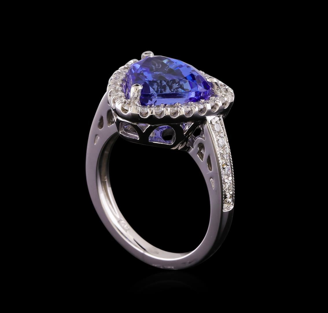 One electronically tested 14KT white gold lady's cast fashion ring with a halo with a bright polish with milgrain detailing finish. The featured lady's ring has a shank measuring 2.26 millimeters wide. Identified with markings of "14K". Condition is new, good workmanship. Containing: One prong set pear modified brilliant cut natural tanzanite, measuring 10.20 x 10.60 x 7.91mm, (depth est.) approximate weight of 5.48ct., clarity is eye clean, medium, moderately strong, violetish blue color, (GIA vB 5/4), cut is very good. Transmitting light with no distortion, transparent. Colored gemstones are presumed to have been subjected to commonly used enhancement processes. Graded in the setting. Thirty-Six prong set round brilliant cut diamonds, measuring 1.55 - 1.45 x 0.93mm (depth est.) approximate total weight of 36 Stones = 0.46ct. Graded in the setting. Clarity: SI-1 to SI-2. Color: H - I. Cut Good. Total Weight of Colored Stones 5.48ct. Total Weight of Diamonds 0.46ct. Total Weight of Ring 7.00gm. GAS Appraised at $11,025.00.