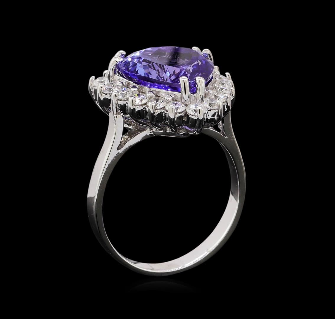 One electronically tested 14KT white gold lady's cast fashion ring with a cathedral basket halo with a bright polish finish. The featured lady's ring has a shank measuring 2.75 millimeters in width. Identified with markings of 'K14'. Condition is new, good workmanship. Containing: One prong set pear modified brilliant cut natural tanzanite, measuring 11.80 x 11.30 x 6.71mm, (depth est.) approximate weight of 5.49ct., clarity is eye clean, medium, moderately strong, violetish blue color, (GIA vB 5/4), cut is very good. Transmitting light with no distortion, transparent. Colored gemstones are presumed to have been subjected to commonly used enhancement processes. Graded in the setting. Eighteen prong set round brilliant cut diamonds, measuring 2.40 - 2.30 x 1.45mm (depth est.) approximate total weight of 18 Stones = 0.88ct. Graded in the setting. Clarity SI-1 to SI-2. Color: H - I Cut Good. Total Weight of Colored Stones 5.49ct.. Total Weight of Diamonds 0.88ct.. Total Weight of Ring 6.20gm. GAS Appraised at $11,565.00.