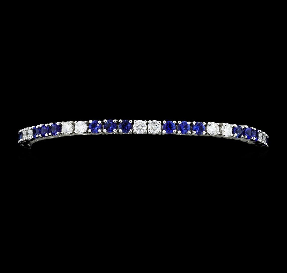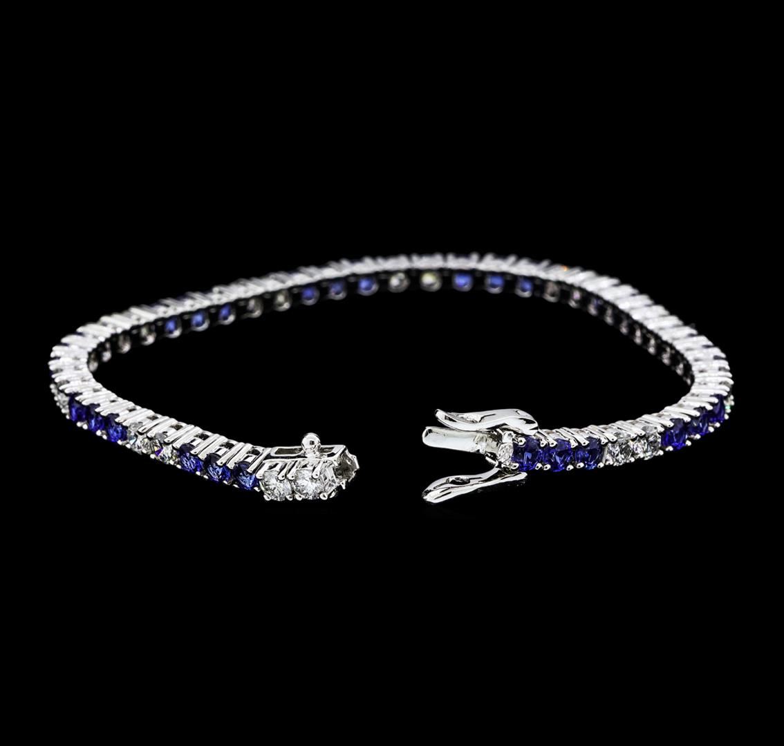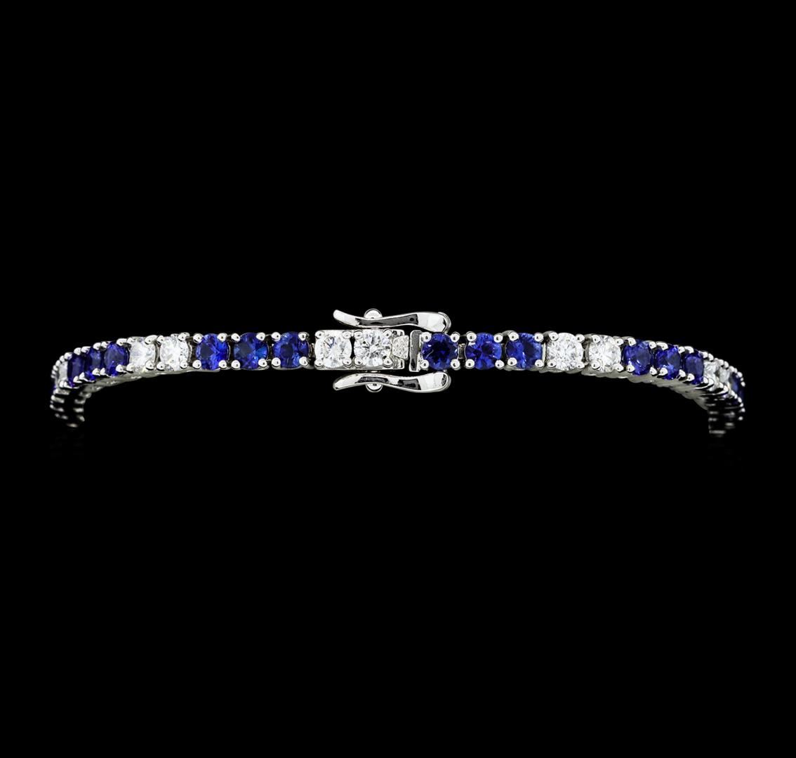 One electronically tested 14KT white gold lady's combination cast & assembled fashion tennis bracelet with a tongue clasp with double foldover safeties with a bright polish finish. The featured lady's bracelet measures approximately seven inches in length. Identified with markings of '14K'. Condition is new, good workmanship. Containing: Thirty prong set round modified brilliant cut natural blue sapphires, measuring 3.30 - 3.20 x 2.11 mm, (depth est.) approximate total weight of 5.50ct., clarity is eye clean, medium, strong, blue color, (GIA B 5/5), cut is very good. Transmitting light with no distortion, transparent. Colored gemstones are presumed to have been subjected to commonly used enhancement processes. Graded in the setting. Twenty prong set round brilliant cut diamonds, measuring 3.40 - 3.20 x 2.11mm (depth est.) approximate total weight of 20 Stones = 2.89ct. Graded in the setting. Color H - I Clarity VS-2 to SI-2 Cut Good. Total Weight of Colored Stones 5.50ct.. Total Weight of Diamonds 2.89ct.. Total Weight of Bracelet 15.90gm GAS Appraised at $15160.00. GAS Appraised at $15,160.00.