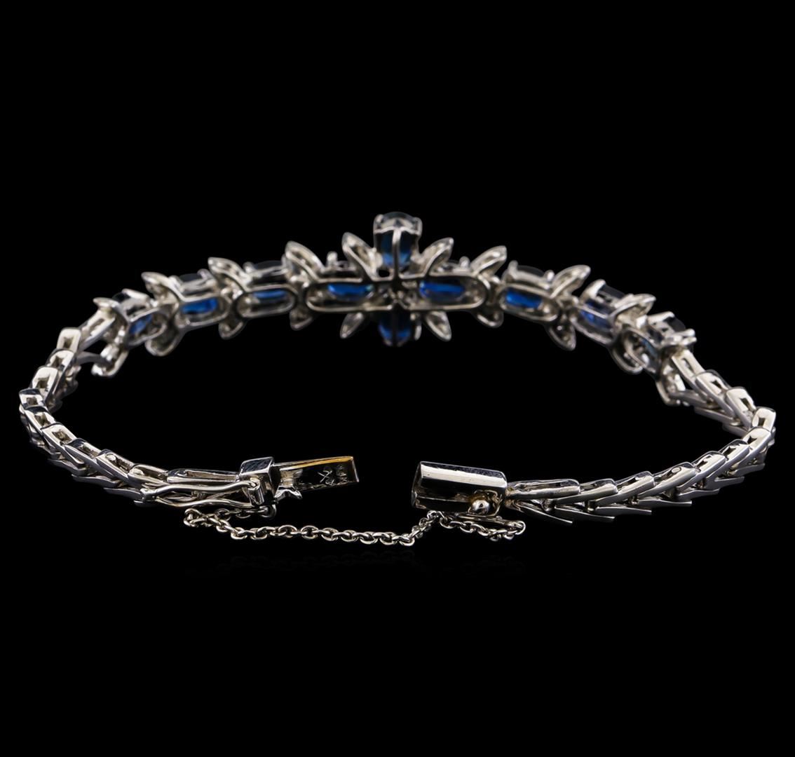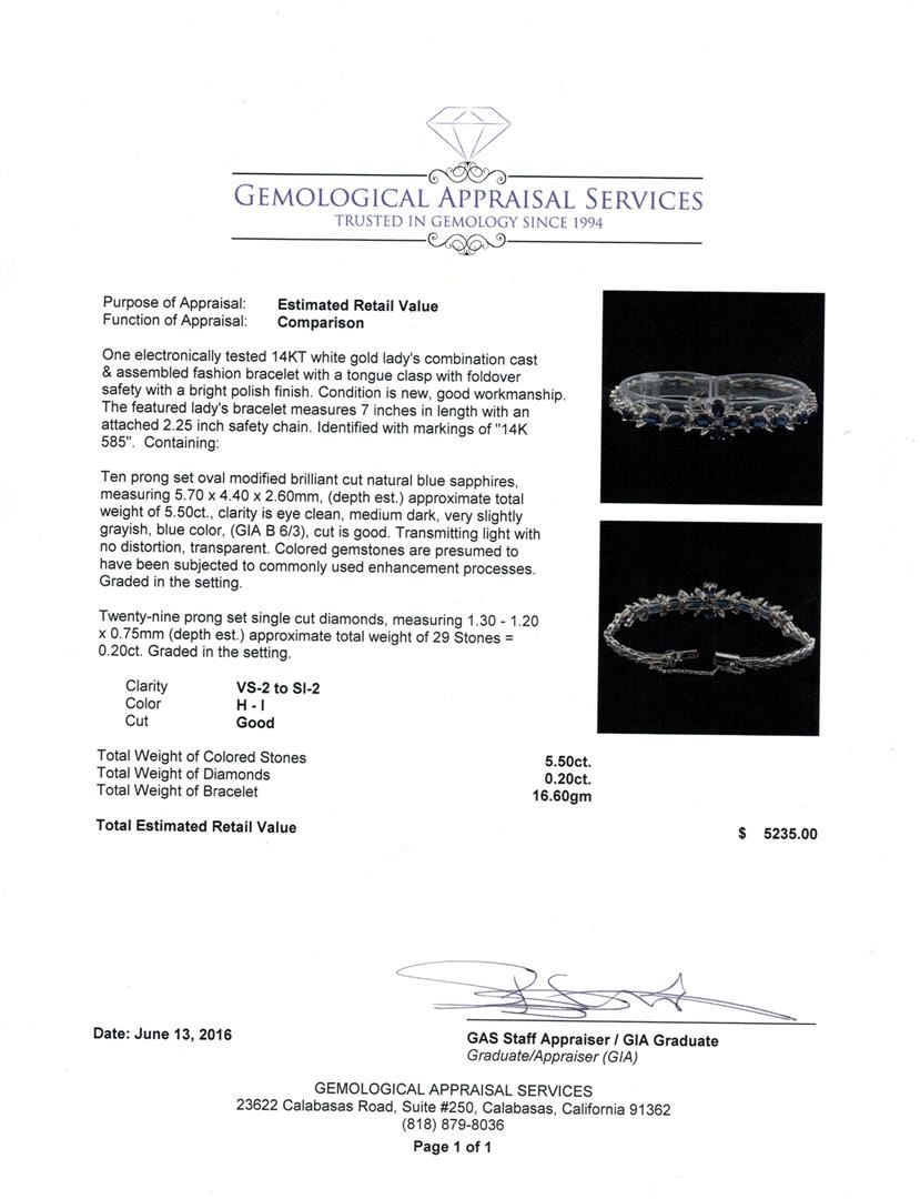One electronically tested 14KT white gold lady's combination cast & assembled fashion bracelet with a tongue clasp with foldover safety with a bright polish finish. The featured lady's bracelet measures 7 inches in length with an attached 2.25 inch safety chain. Identified with markings of "14K 585". Condition is new, good workmanship. Containing: Ten prong set oval modified brilliant cut natural blue sapphires, measuring 5.70 x 4.40 x 2.60mm, (depth est.) approximate total weight of 5.50ct., clarity is eye clean, medium dark, very slightly grayish, blue color, (GIA B 6/3), cut is good. Transmitting light with no distortion, transparent. Colored gemstones are presumed to have been subjected to commonly used enhancement processes. Graded in the setting. Twenty-Nine prong set single cut diamonds, measuring 1.30 - 1.20 x 0.75mm (depth est.) approximate total weight of 29 Stones = 0.20ct. Graded in the setting. Clarity: VS-2 to SI-2. Color: H - I. Cut Good. Total Weight of Colored Stones 5.50ct. Total Weight of Diamonds 0.20ct. Total Weight of Bracelet 16.60gm. GAS Appraised at $5,235.00.