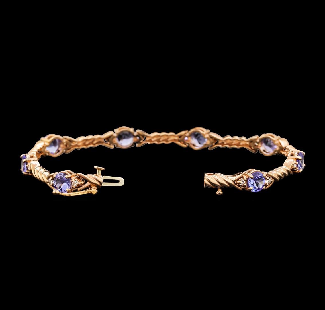 One electronically tested 14KT rose gold lady's combination cast & assembled fashion bracelet with a tongue clasp with foldover safety with a bright polish finish. The featured lady's bracelet has eight segments each with one round tanzanite flanked by two round brilliant diamonds, connected by twisted rope motifs. The bracelet measures approximately seven inches in length. Identified with markings of '14K'. Condition is new, good workmanship. Containing: Eight prong set round modified brilliant cut natural tanzanites, measuring 5.65 - 5.45 x 3.10 mm, (depth est.) approximate total weight of 5.50ct., clarity is eye clean, medium light, moderately strong, violet color, (GIA V 4/4), cut is good. Transmitting light with no distortion, transparent. Colored gemstones are presumed to have been subjected to commonly used enhancement processes. Graded in the setting. Sixteen prong set round brilliant cut diamonds, measuring 1.80 - 1.75 x 1.10mm (depth est.) approximate total weight of 16 Stones = 0.34ct. Graded in the setting. Clarity VS-2 to SI-1. Color: H - I Cut Good. Total Weight of Colored Stones 5.50ct.. Total Weight of Diamonds 0.34ct.. Total Weight of Bracelet 12.30gm. GAS Appraised at $4,215.00.