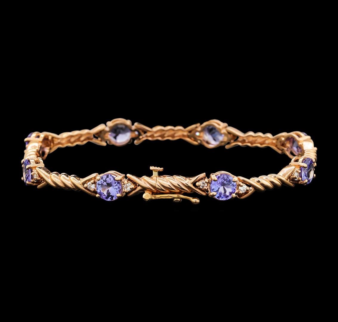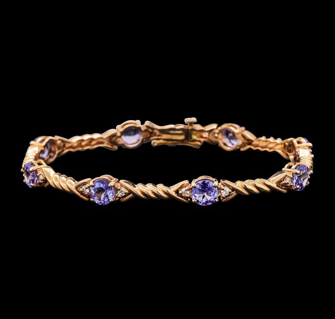 One electronically tested 14KT rose gold lady's combination cast & assembled fashion bracelet with a tongue clasp with foldover safety with a bright polish finish. The featured lady's bracelet has eight segments each with one round tanzanite flanked by two round brilliant diamonds, connected by twisted rope motifs. The bracelet measures approximately seven inches in length. Identified with markings of '14K'. Condition is new, good workmanship. Containing: Eight prong set round modified brilliant cut natural tanzanites, measuring 5.65 - 5.45 x 3.10 mm, (depth est.) approximate total weight of 5.50ct., clarity is eye clean, medium light, moderately strong, violet color, (GIA V 4/4), cut is good. Transmitting light with no distortion, transparent. Colored gemstones are presumed to have been subjected to commonly used enhancement processes. Graded in the setting. Sixteen prong set round brilliant cut diamonds, measuring 1.80 - 1.75 x 1.10mm (depth est.) approximate total weight of 16 Stones = 0.34ct. Graded in the setting. Clarity VS-2 to SI-1. Color: H - I Cut Good. Total Weight of Colored Stones 5.50ct.. Total Weight of Diamonds 0.34ct.. Total Weight of Bracelet 12.30gm. GAS Appraised at $4,215.00.
