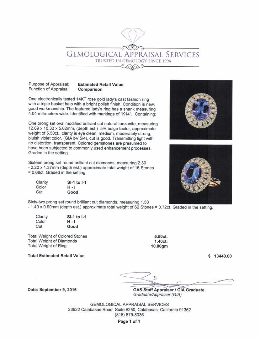 One electronically tested 14KT rose gold lady's cast fashion ring with a triple basket halo with a bright polish finish. The featured lady's ring has a shank measuring 4.04 millimeters wide. Identified with markings of 'K14'. Condition is new, good workmanship. Containing: One prong set oval modified brilliant cut natural tanzanite, measuring 12.69 x 10.32 x 5.62mm, (depth est.) 5%. bulge factor, approximate weight of 5.50ct., clarity is eye clean, medium, moderately strong, bluish violet color, (GIA bV 5/4), cut is good. Transmitting light with no distortion, transparent. Colored gemstones are presumed to have been subjected to commonly used enhancement processes. Graded in the setting. Sixteen prong set round brilliant cut diamonds, measuring 2.30 - 2.20 x 1.37mm (depth est.) approximate total weight of 16 Stones = 0.68ct. Graded in the setting. Clarity SI-1 to I-1. Color: H - I Cut Good Sixty-Two prong set round brilliant cut diamonds, measuring 1.50 - 1.40 x 0.90mm (depth est.) approximate total weight of 62 Stones = 0.72ct. Graded in the setting. Clarity SI-1 to I-1. Color: H - I Cut Good. Total Weight of Colored Stones 5.50ct.. Total Weight of Diamonds 1.40ct.. Total Weight of Ring 10.80gm GAS Appraised at $13,440.00.