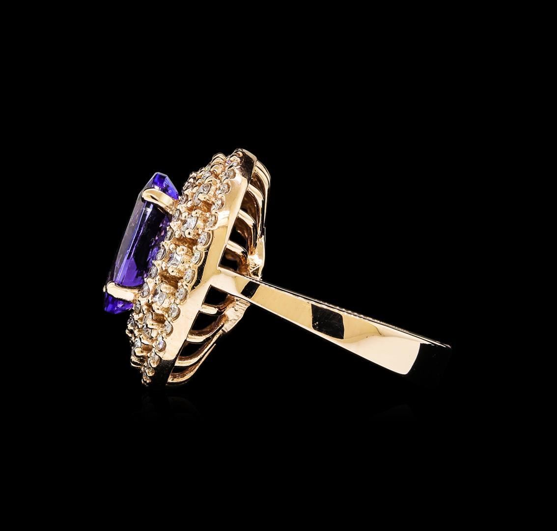 One electronically tested 14KT rose gold lady's cast fashion ring with a triple basket halo with a bright polish finish. The featured lady's ring has a shank measuring 4.04 millimeters wide. Identified with markings of 'K14'. Condition is new, good workmanship. Containing: One prong set oval modified brilliant cut natural tanzanite, measuring 12.69 x 10.32 x 5.62mm, (depth est.) 5%. bulge factor, approximate weight of 5.50 ct., clarity is eye clean, medium, moderately strong, bluish violet color, (GIA bV 5/4), cut is good. Transmitting light with no distortion, transparent. Colored gemstones are presumed to have been subjected to commonly used enhancement processes. Graded in the setting. Sixteen prong set round brilliant cut diamonds, measuring 2.30 - 2.20 x 1.37mm (depth est.) approximate total weight of 16 Stones = 0.68ct. Graded in the setting. Clarity SI-1 to I-1. Color: H - I Cut Good Sixty-Two prong set round brilliant cut diamonds, measuring 1.50 - 1.40 x 0.90mm (depth est.) approximate total weight of 62 Stones = 0.72ct. Graded in the setting. Clarity SI-1 to I-1. Color: H - I Cut Good. Total Weight of Colored Stones 5.50 ct.. Total Weight of Diamonds 1.40 ct.. Total Weight of Ring 10.80gm GAS Appraised.