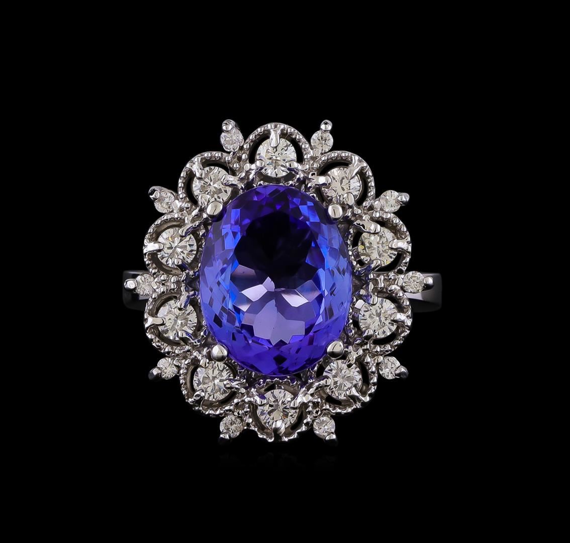 One electronically tested 14KT white gold lady's cast fashion ring with a double basket halo with a bright polish with milgrain detailing finish. The featured lady's has a shank measuring 2.78 millimeters in width. Identified with markings of "K14". Condition is new, good workmanship. Containing: One prong set oval modified brilliant cut natural tanzanite, measuring 12.36 x 9.87 x 5.85mm, (depth est.) 5%. bulge factor, approximate weight of 5.50ct., clarity is eye clean, medium, moderately strong, bluish violet color, (GIA bV 5/4), cut is very good. Transmitting light with no distortion, transparent. Colored gemstones are presumed to have been subjected to commonly used enhancement processes. Graded in the setting. Ten prong set round brilliant cut diamonds, measuring 2.60 - 2.50 x 1.56mm (depth est.) approximate total weight of 10 Stones = 0.62ct. Graded in the setting. Clarity: SI-1 to SI-2. Color: H - I. Cut Good Ten prong set round brilliant cut diamonds, measuring 1.45 - 1.40 x 0.88mm (depth est.) approximate total weight of 10 Stones = 0.12ct. Graded in the setting. Clarity: SI-1 to SI-2. Color: G - Good. Total Weight of Colored Stones 5.50ct. Total Weight of Diamonds 0.74ct. Total Weight of Ring 7.90gm. GAS Appraised.