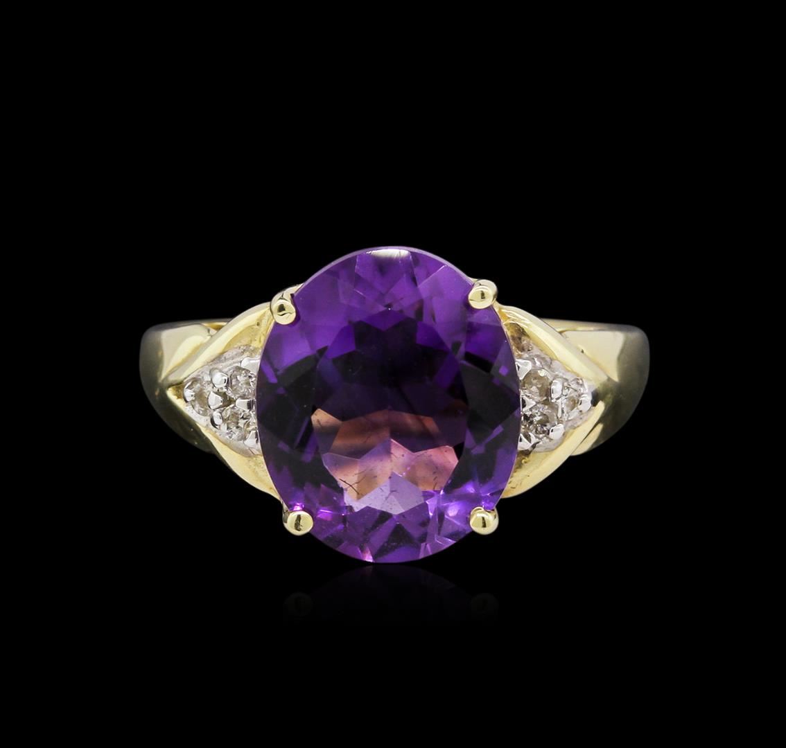5.50ct Amethyst and Diamond Ring - 14KT Yellow Gold. 4.50 grams total weight; Size 7; 5.5 ct amethyst; 0.06 pts diamonds.