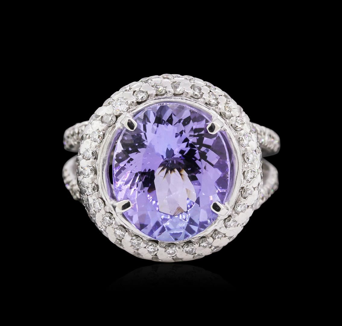 One electronically tested platinum lady's cast fashion ring with a split shank halo with a bright polish finish. The featured lady's ring has two attached sizing balls and a double shank measuring 4.18 millimeters wide. Condition is used, good workmanship. Containing: One prong set oval modified brilliant cut natural tanzanite, measuring 12.50 x 10.67 x 6.35mm, approximate weight of 5.50ct., clarity is eye clean, type I, medium light, very slightly grayish, bluish violet color, (GIA bV 4/3), cut is very good. Transmitting light with no distortion, transparent. Colored gemstones are presumed to have been subjected to commonly used enhancement processes. Graded in the setting. One Hundred Eighty prong set round brilliant cut diamonds, measuring 1.50 - 1.45 x 0.96mm (depth est.) approximate total weight of 180 Stones = 2.30ct. Graded in the setting. Clarity: VS-2 to SI-1. Color: G - Very Good. Total Weight of Colored Stones 5.50ct. Total Weight of Diamonds 2.30ct. Total Weight of Ring 15.20gm. GAS Appraised at $14,845.00.