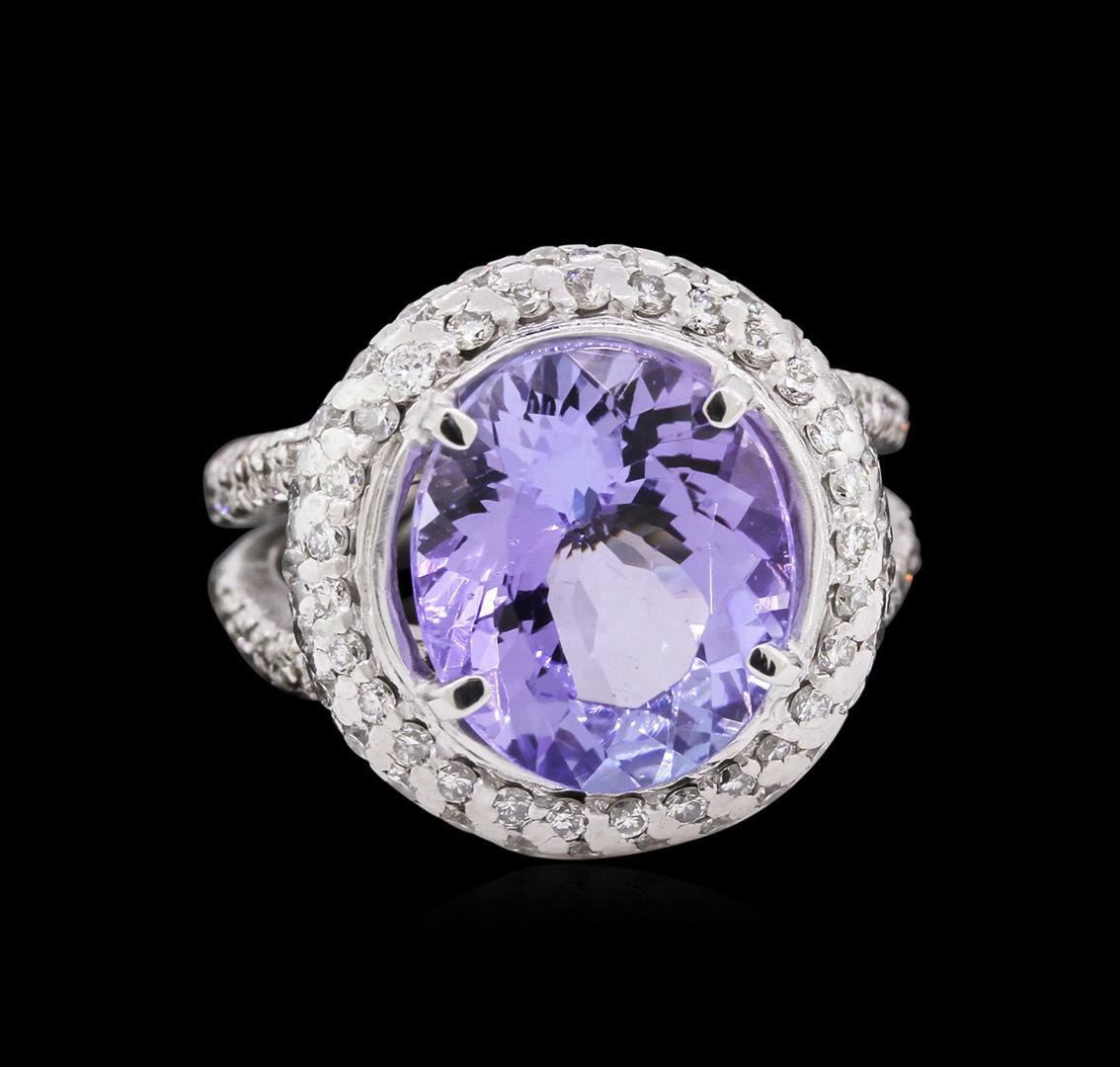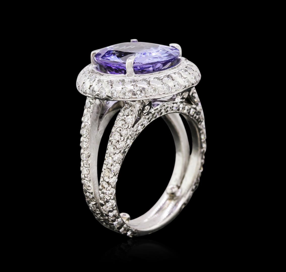 One electronically tested platinum lady's cast fashion ring with a split shank halo with a bright polish finish. The featured lady's ring has two attached sizing balls and a double shank measuring 4.18 millimeters wide. Condition is used, good workmanship. Containing: One prong set oval modified brilliant cut natural tanzanite, measuring 12.50 x 10.67 x 6.35mm, approximate weight of 5.50ct., clarity is eye clean, type I, medium light, very slightly grayish, bluish violet color, (GIA bV 4/3), cut is very good. Transmitting light with no distortion, transparent. Colored gemstones are presumed to have been subjected to commonly used enhancement processes. Graded in the setting. One Hundred Eighty prong set round brilliant cut diamonds, measuring 1.50 - 1.45 x 0.96mm (depth est.) approximate total weight of 180 Stones = 2.30ct. Graded in the setting. Clarity: VS-2 to SI-1. Color: G - Very Good. Total Weight of Colored Stones 5.50ct. Total Weight of Diamonds 2.30ct. Total Weight of Ring 15.20gm. GAS Appraised at $14,845.00.