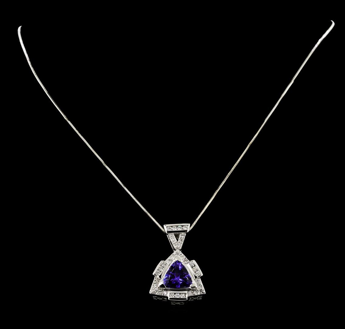 One electronically tested 14KT white gold lady's combination cast & assembled fashion pendant & chain 18.0' long, 1mm square snake chain with a lobster claw clasp with a bright polish finish. Identified with markings of '14K'. Condition is new, good workmanship. Containing: One prong set triangle modified brilliant cut natural tanzanite, measuring 11.90 x 11.40 x 6.74mm, (depth est.) approximate weight of 5.51ct., clarity is eye clean, medium dark, very slightly grayish, violetish blue color, (GIA vB 6/3), cut is very good. Transmitting light with no distortion, transparent. Colored gemstones are presumed to have been subjected to commonly used enhancement processes. Graded in the setting. Thirty-Three channel and prong set round brilliant cut diamonds, measuring 2.10 - 1.90 x 1.24mm (depth est.) approximate total weight of 33 Stones = 1.00ct. Graded in the setting. Color H - I Clarity SI-1 to SI-2 Cut Good. Total Weight of Colored Stones 5.51ct.. Total Weight of Diamonds 1.00ct.. Total Weight of Pendant & Chain 16.50gm GAS Appraised at $11725.00. GAS Appraised at $11,725.00.